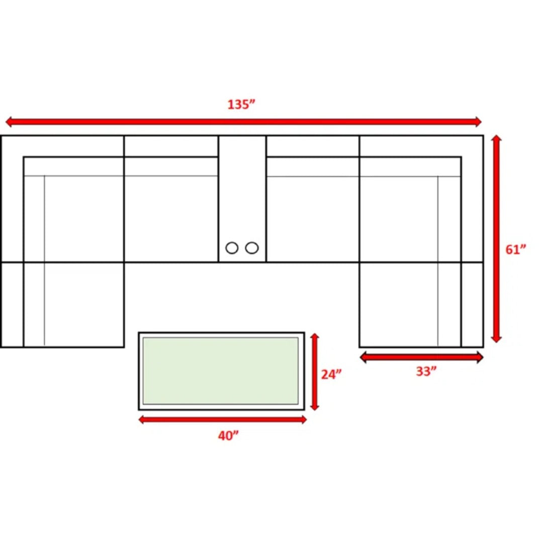 - Product dimensions (prominent): Overall product dimensions: 40.16 L x 14.57 W x 24.8 H. Sofa: 26" H x 135" W x 61" D. Sectionals: 26" H x 33" W x 33" D. Sectional with center console: 134" W x 60" D.