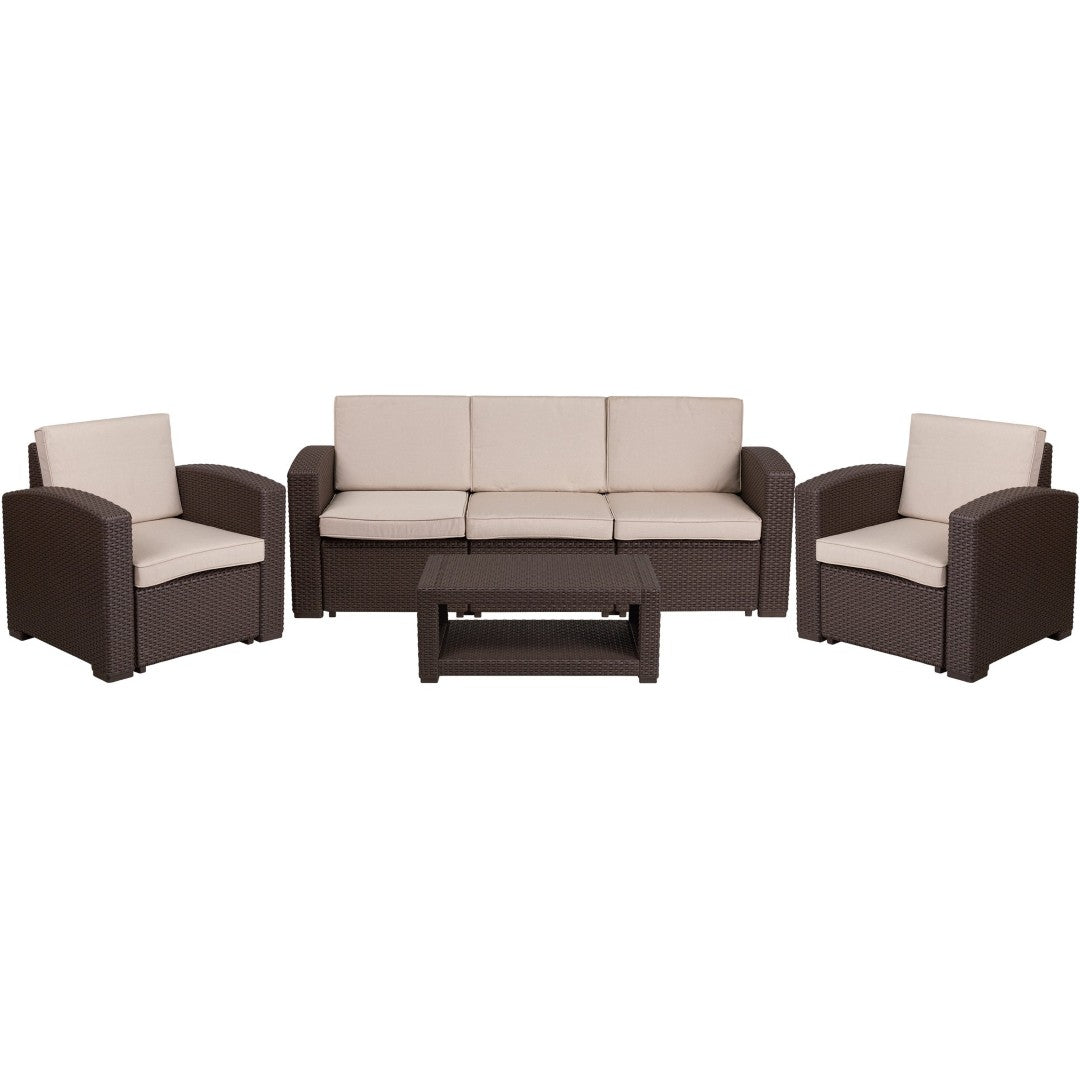 - Finish & Materials: Chocolate brown faux rattan finish with polyester fabric covers; foam and resin construction for lightweight durability.
