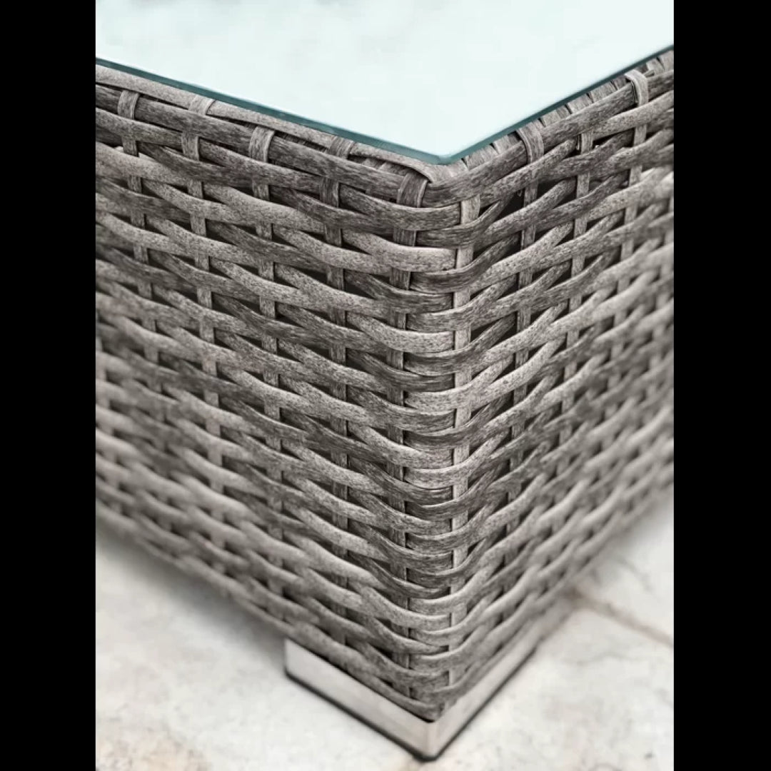 - It includes a square coffee table with a glass top, two side tables with convenient cup holders, and seven chairs that combine to form an L-shaped corner sectional. Each piece has a clean-lined aluminum inner frame wrapped in all-weather wicker rattan.