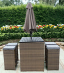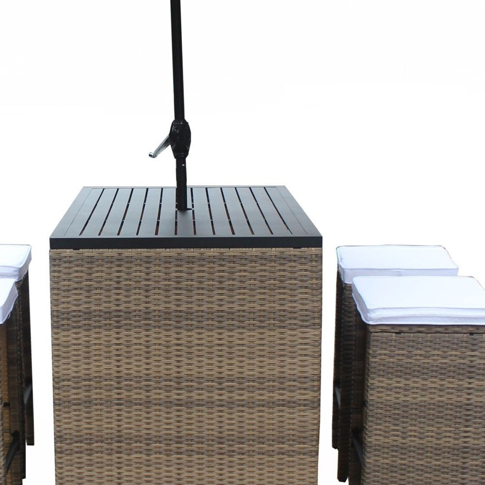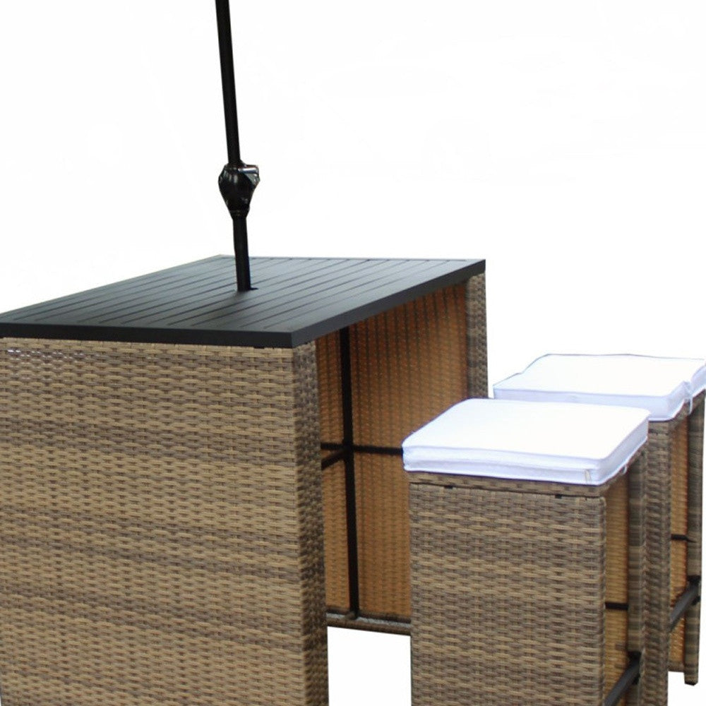 - Modern Outdoor Faux Rattan Bar Table, Stools, and Umbrella Set.