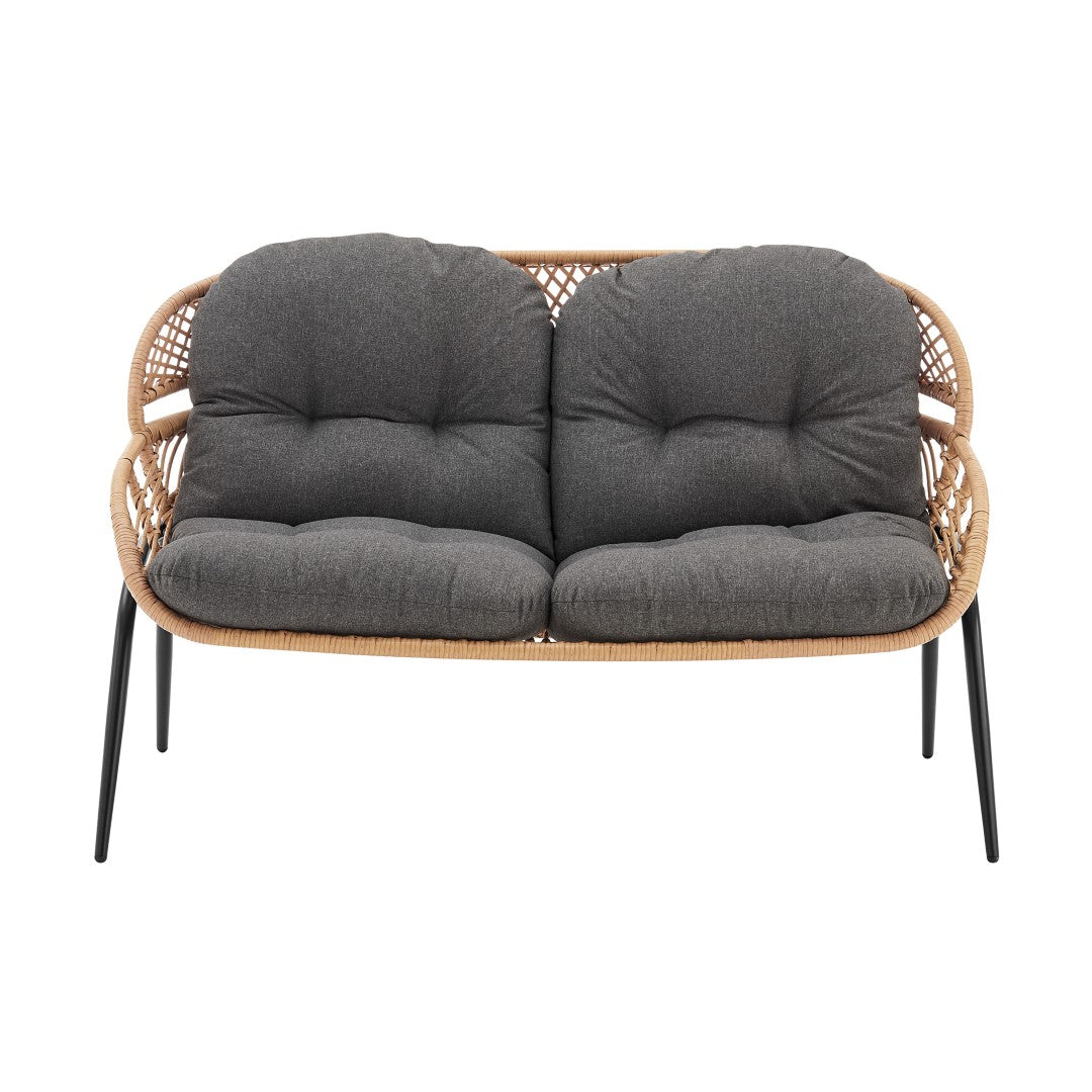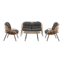 Escape to the rustic charm of the Pine Collection, where nature-inspired design meets outdoor comfort. With two armchairs, a cozy loveseat, and a coffee table adorned with removable tempered glass, this set invites you to unwind amidst the elements. Crafted with rust-resistant steel wrapped in PE rattan rope, and featuring removable cushions in high-quality waterproof fabric with UV-resistant coating, every moment shared in this outdoor sanctuary is embraced by the tranquility of nature.- Modern 4-Piece Outdoor Conversation Patio Set with 2 Armchairs, 1 Loveseat, and 1 Coffee Table.