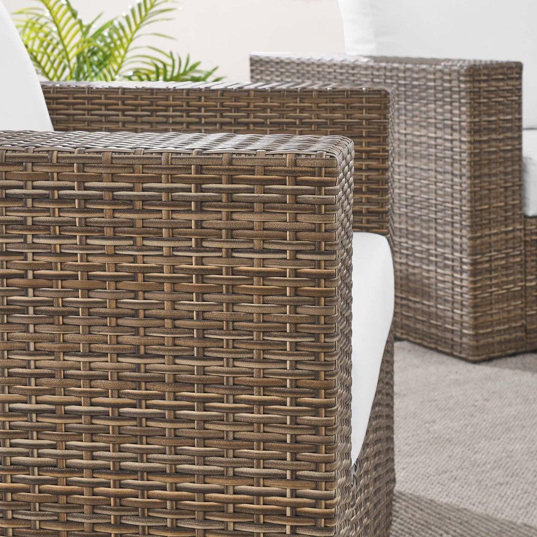 Bring comfortable, contemporary style to your outdoor living area with the Convene 4-Piece Outdoor Patio Furniture Set. Crafted from weather-resistant synthetic rattan woven over powder-coated aluminum frames, this set combines durability with modern appeal — ideal for patios, decks, porches, and poolside lounges. Plush, dense-foam cushions with water-resistant zippered covers and non-marking foot pads provide lasting comfort and floor protection, while the tempered glass-topped table offers a low-maintenance surface for drinks and decor. Assembly is required and clear instructions are included.