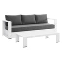 Bring modern refinement and durable comfort to your outdoor living area with this Tahoe 2-piece patio set. Designed for poolside lounging and relaxed alfresco gatherings, the set pairs a spacious waterproof sofa with a coordinating coffee table. Built from powder-coated aluminum for long-lasting weather resistance and topped with water-resistant, fabric-covered cushions, this set balances low-maintenance performance with contemporary style.