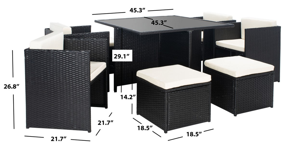 - Full Dimensions [W / D / H]: TABLE: 45.3 x 45.3 x 29.1 CHAIR: 21.7 x 21.7 x 26.8 STOOL: 18.5 x 18.5 x 14.2