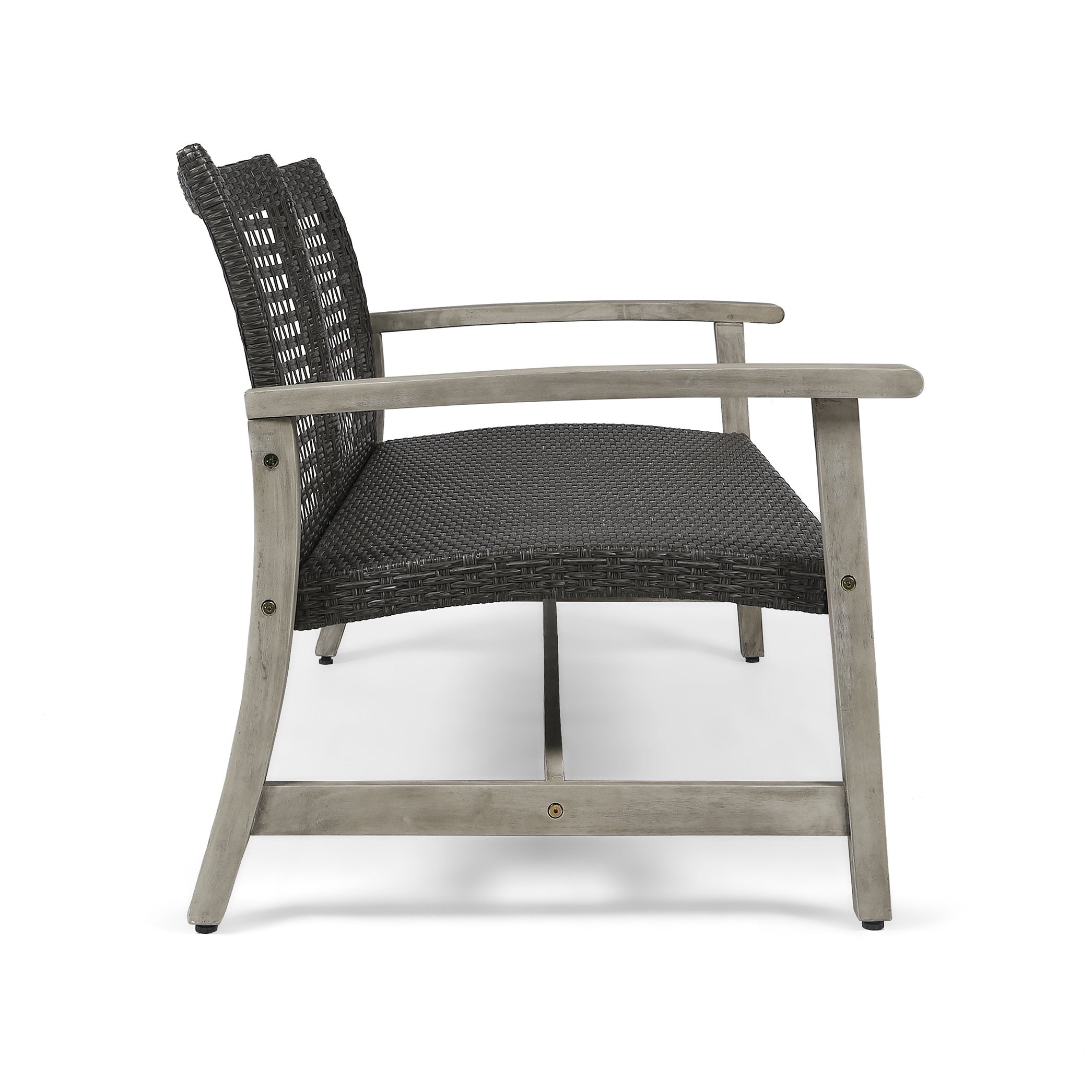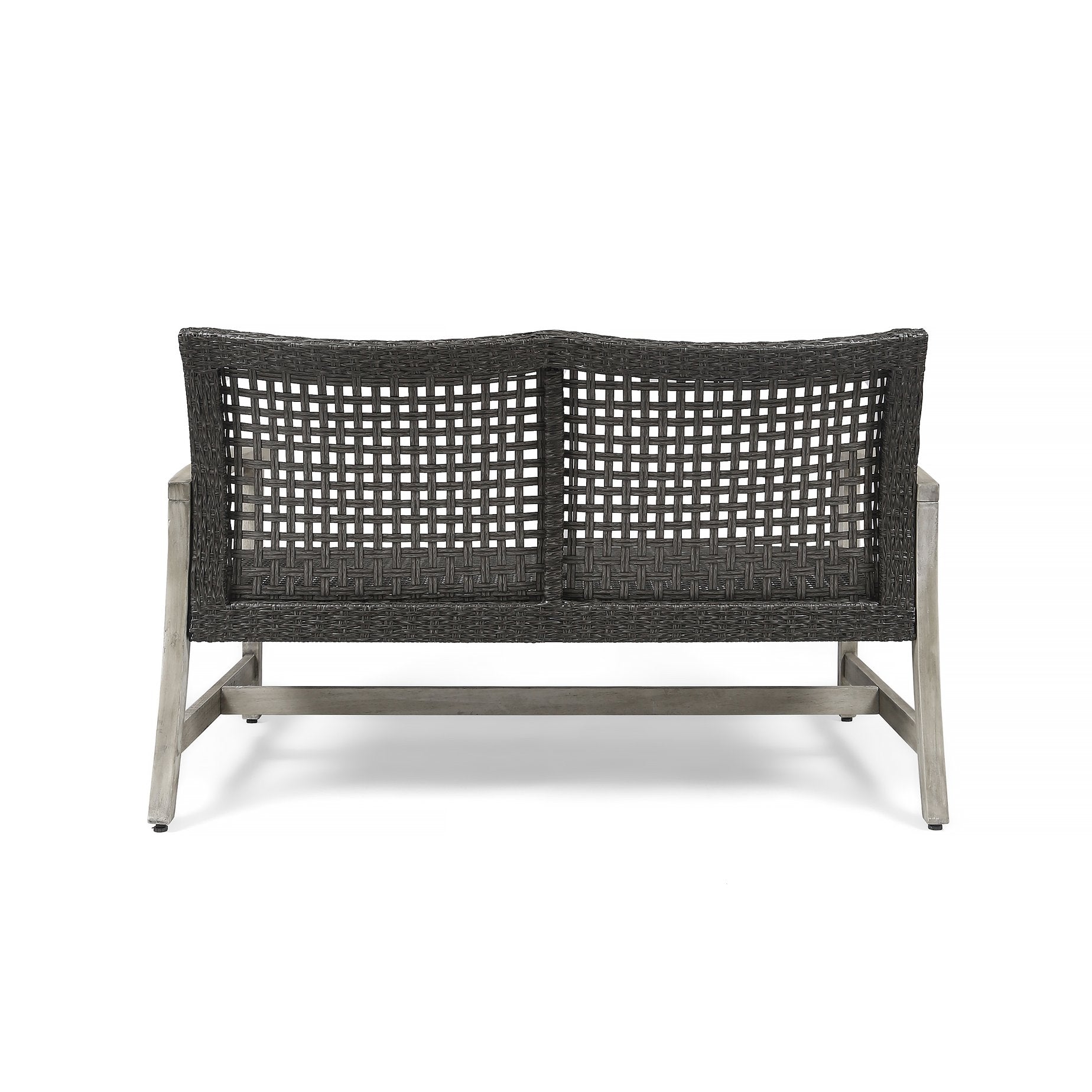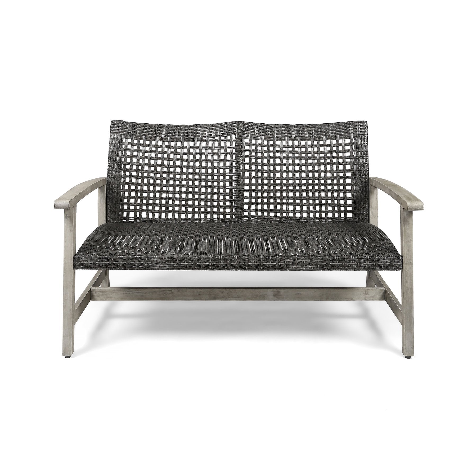 Enjoy relaxed outdoor living with this charming acacia wood and wicker loveseat, crafted to bring warmth and durability to your patio, deck, or backyard conversation area. Its natural woven seat and iron-accented frame combine a classic handcrafted look with robust support, making it an inviting focal point for casual seating and entertaining.
