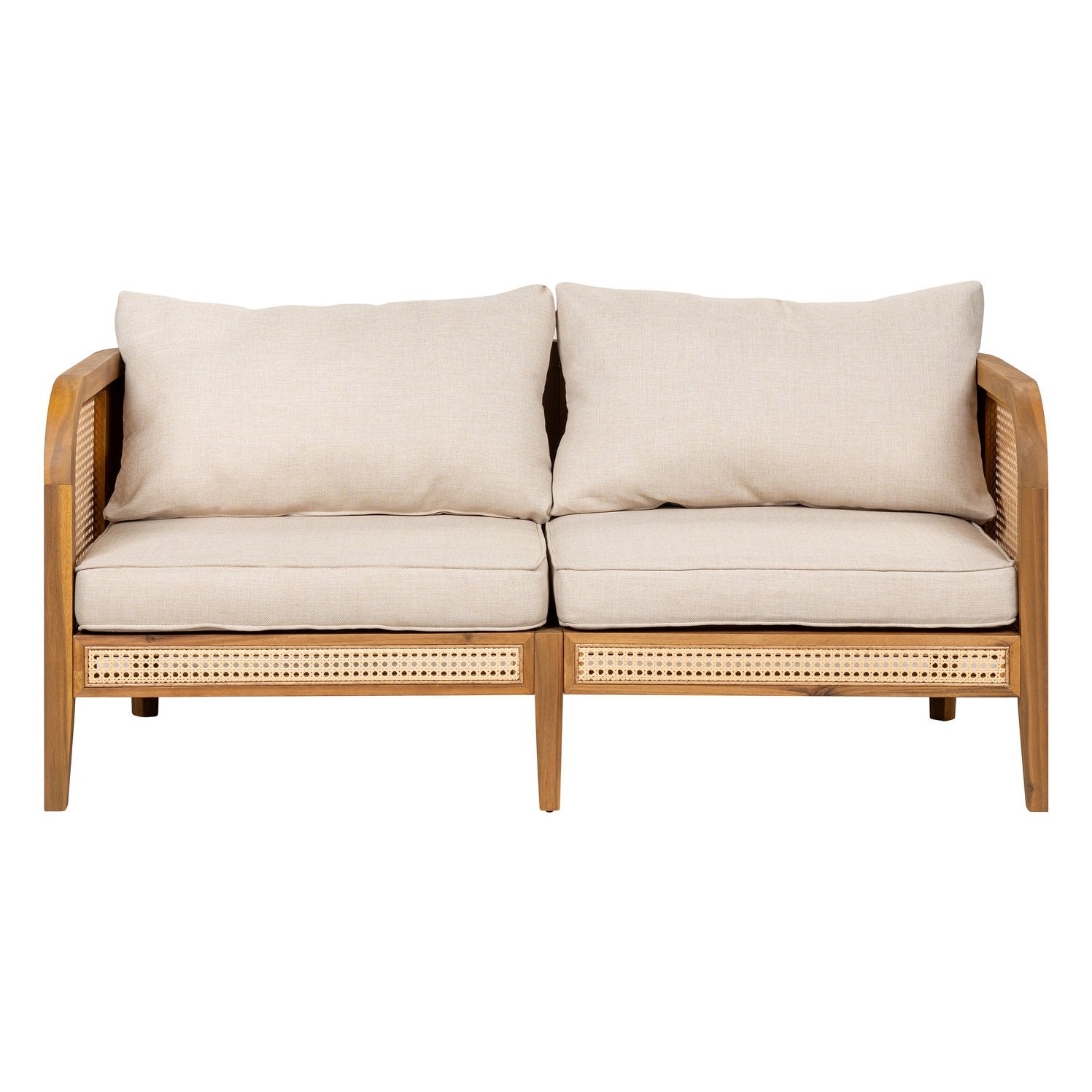 Refresh your outdoor living space with the Kirkby cushioned patio sofa — a refined blend of rustic wicker charm and durable acacia wood construction. Designed for both style and longevity, this loveseat pairs neutral teak and beige tones with comfortable cushions to create a cozy focal point for patios, decks, or garden nooks. Its weather-resistant materials and sturdy build make it an attractive, low-maintenance seating option for seasons of outdoor enjoyment.