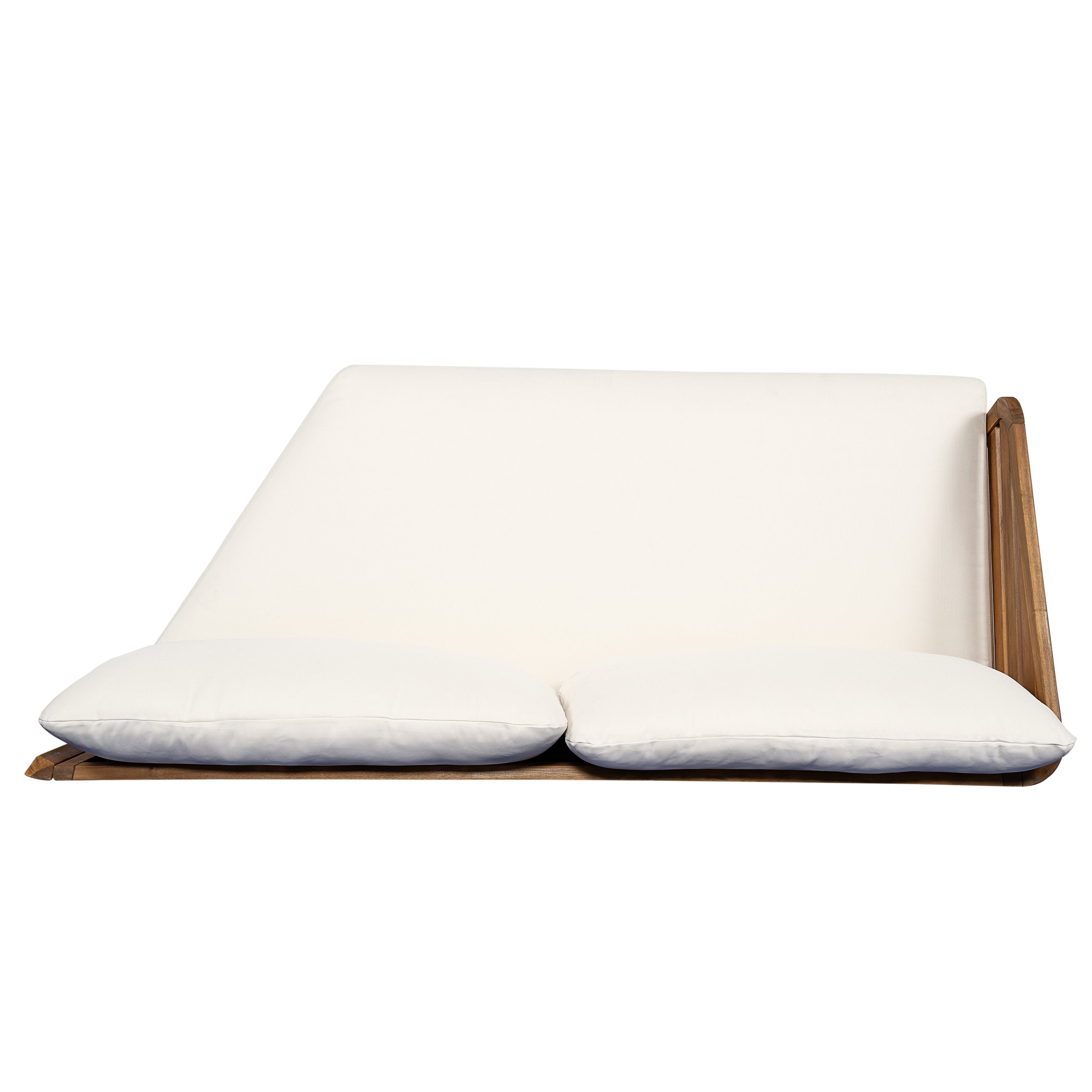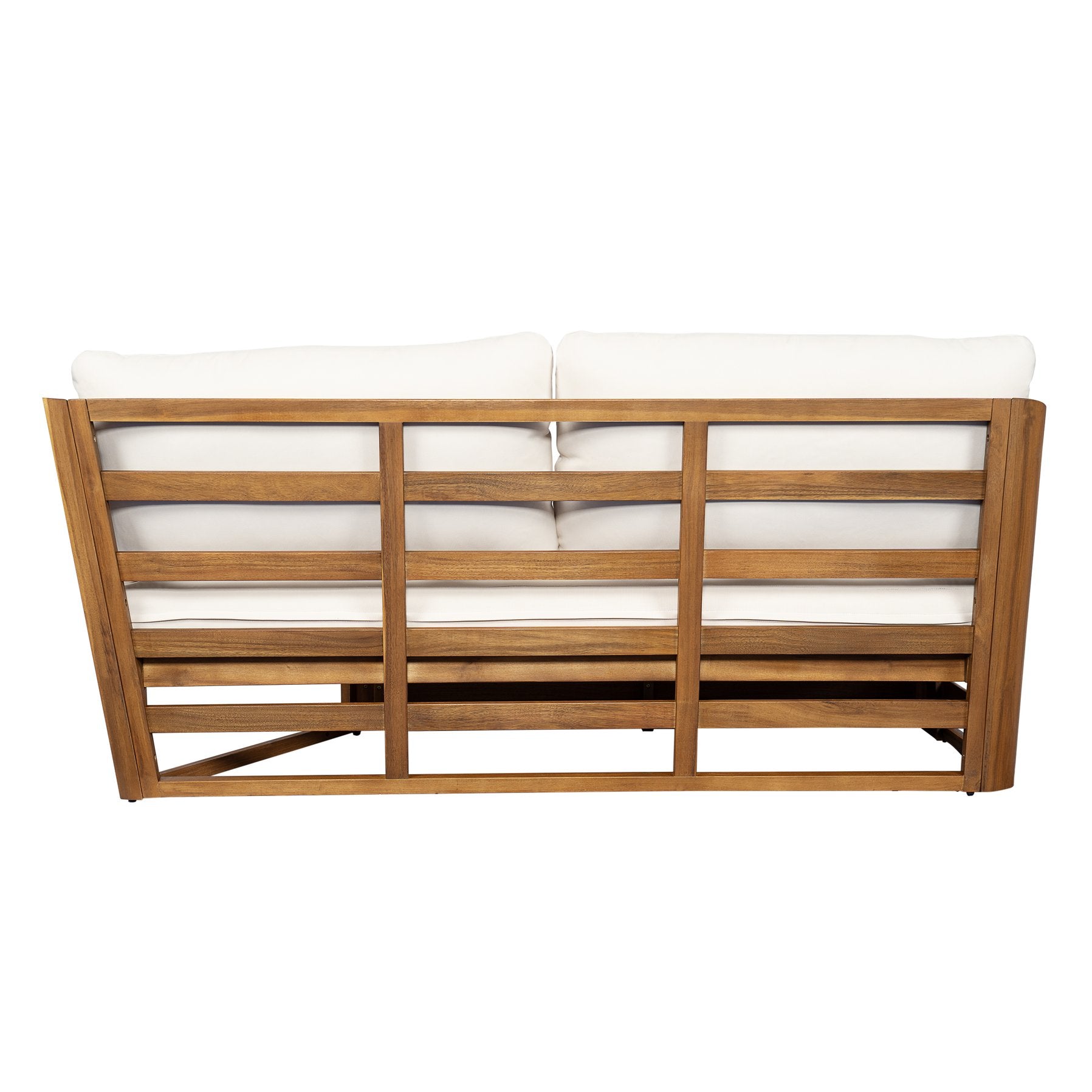 - This patio sofa combines natural elegance with modern comfort, making it the ideal outdoor 2 seater for relaxing solo or hosting guests. With deep, plush lounge chair cushions and a solid acacia frame, this outdoor sectional is a must-have addition to your patio, poolside, or garden seating.