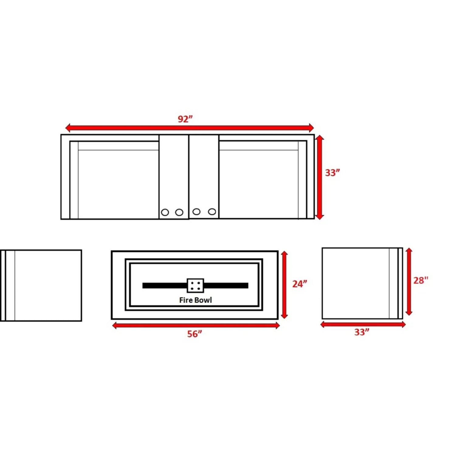 - Fire Pit: Included propane fire pit with fiber-reinforced concrete construction, push-button ignition, and 50,000 BTU output. Includes protective fire pit cover.