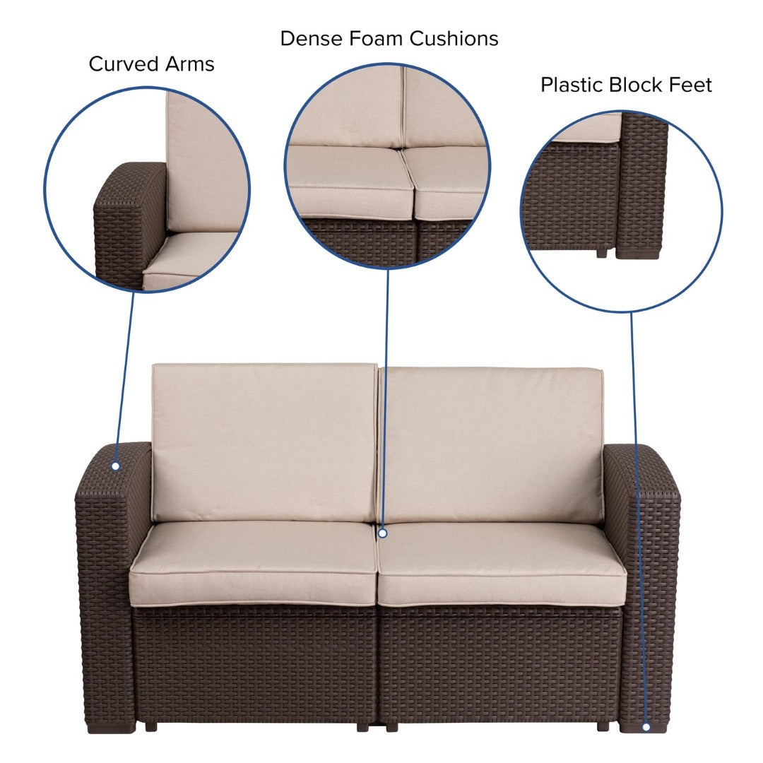 Create a cozy, stylish outdoor retreat with this chocolate brown faux rattan loveseat. Designed for comfort and low maintenance, it pairs deep seating and fire-retardant foam with weather-resistant materials—perfect for relaxing with a book or entertaining guests season after season.