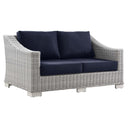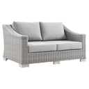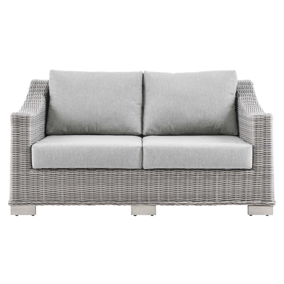 - Outdoor Patio Loveseat Water and UV Resistant Light Gray Synthetic Rattan Powder-Coated Aluminum Frame All-Weather Cushion Covers Non-Marking Foot Glides Loveseat Weight Capacity: 600 lbs.