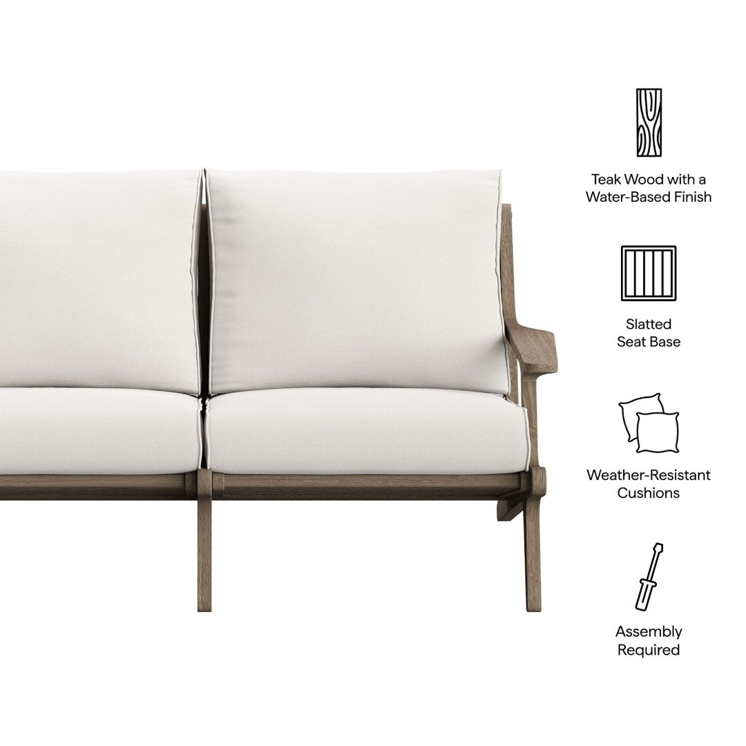 - Teak Wood Outdoor Loveseat Water-Based Finish Slatted Seat Base Weather-Resistant Cushions Stain and Water-Resistant Covers Non-Marking Floor Glides Assembly Required