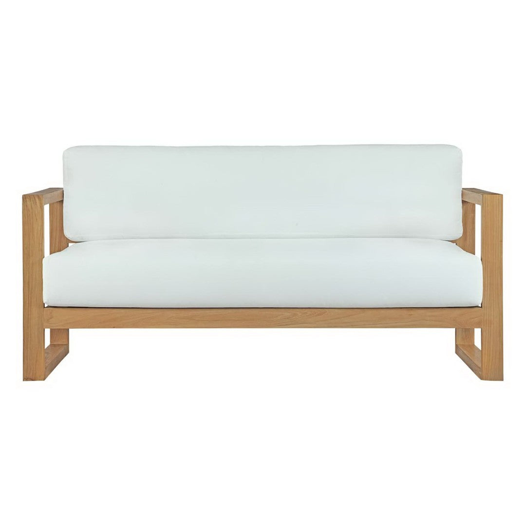 - Modern outdoor teak sofa Solid teak wood construction Richly textured wood grain Water and UV resistant cushions Machine washable covers Assembly required