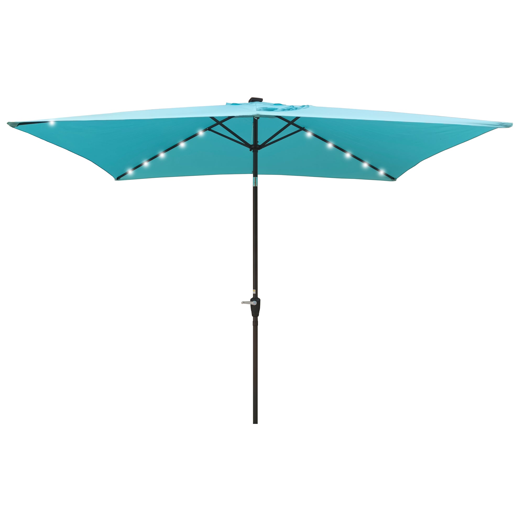 Brighten and shade your outdoor space with this durable rectangular solar LED patio umbrella—designed for effortless operation and evening ambiance. The large 10 x 6.5 ft canopy provides broad, UV-resistant coverage while integrated solar-powered LEDs deliver up to 6–8 hours of soft illumination after a full daylight charge. Built for easy use and year-round performance, this umbrella features a crank lift, push-button tilt, and a sturdy powder-coated steel pole for reliable stability in residential settings.