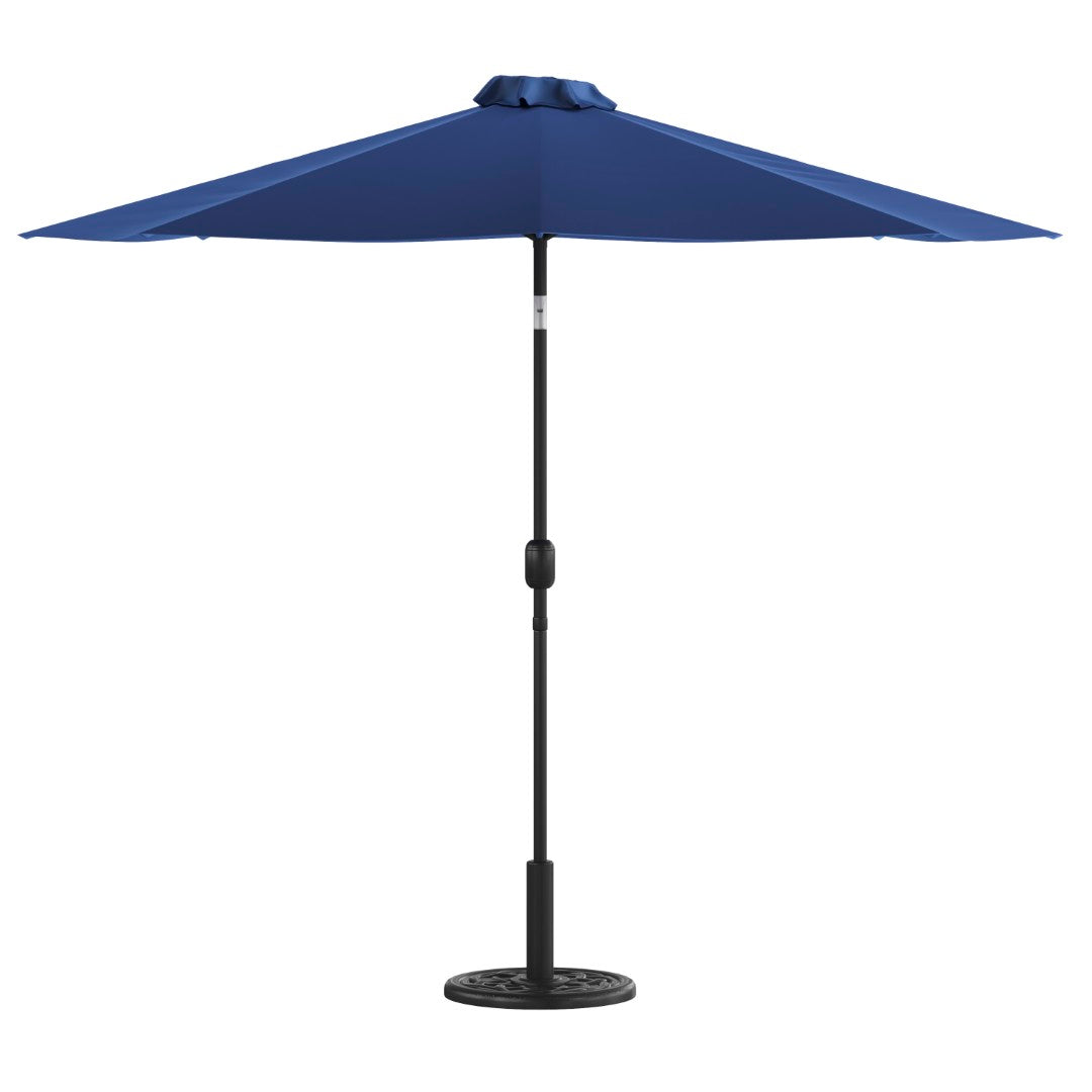 Keep your outdoor space comfortably shaded and stylish with this durable 9-foot round patio umbrella and matching universal cement base. Designed for easy setup and everyday use, the umbrella features a UV-resistant polyester canopy, a smooth crank lift, and a push-button tilt so you can quickly adjust shade as the sun moves. Built with rust-resistant aluminum poles, 8 steel ribs, and a ventilated top, it provides stable protection for guests, furniture, and electronics while the heavy polymer-coated cement base keeps the umbrella freestanding and secure.