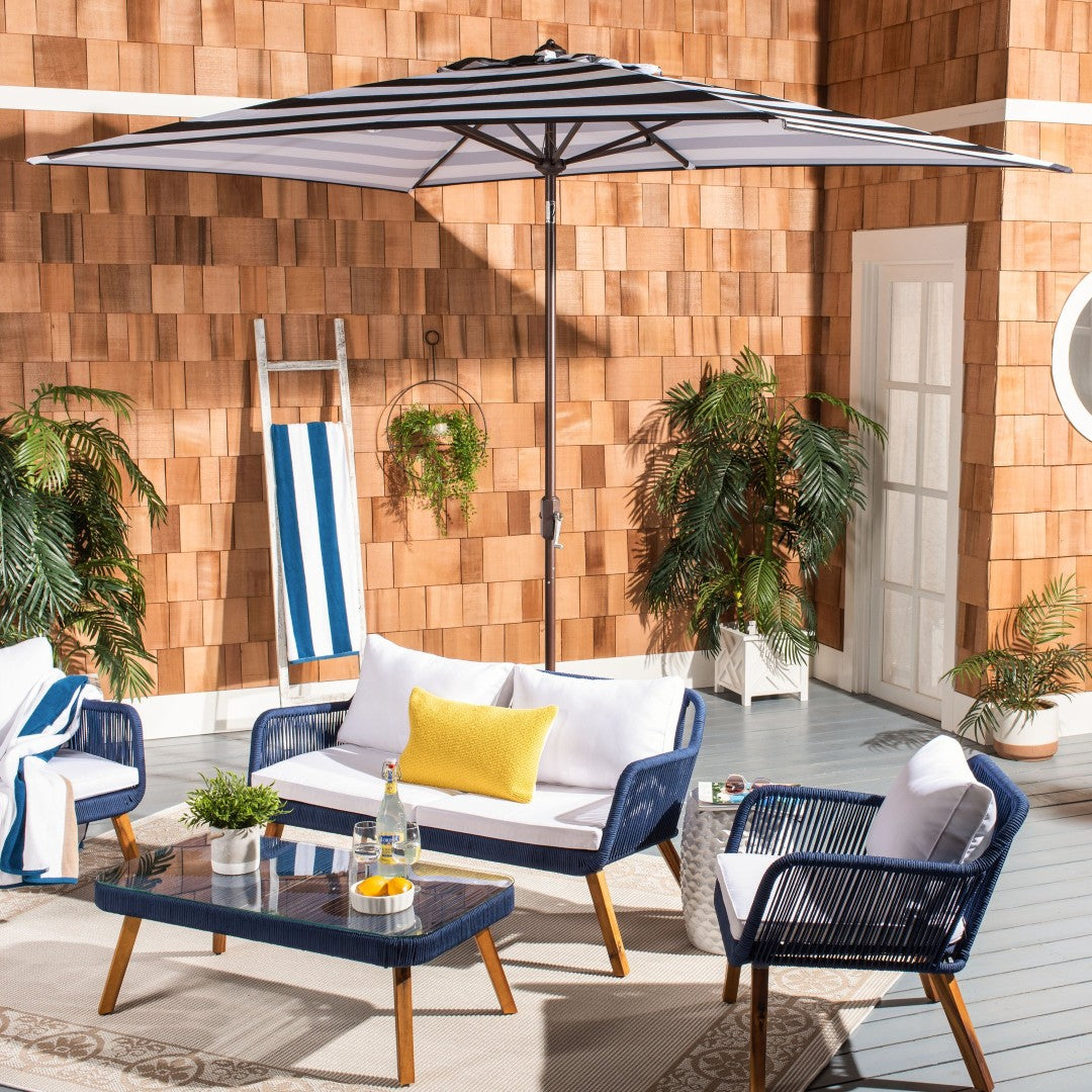 Turn your patio into a chic, art‑deco inspired lounge with this runway-ready market umbrella. Its bold black-and-white stripes and clean rectangular canopy bring a contemporary, high-fashion statement to outdoor living while providing durable sun protection and easy operation for everyday use.