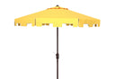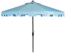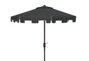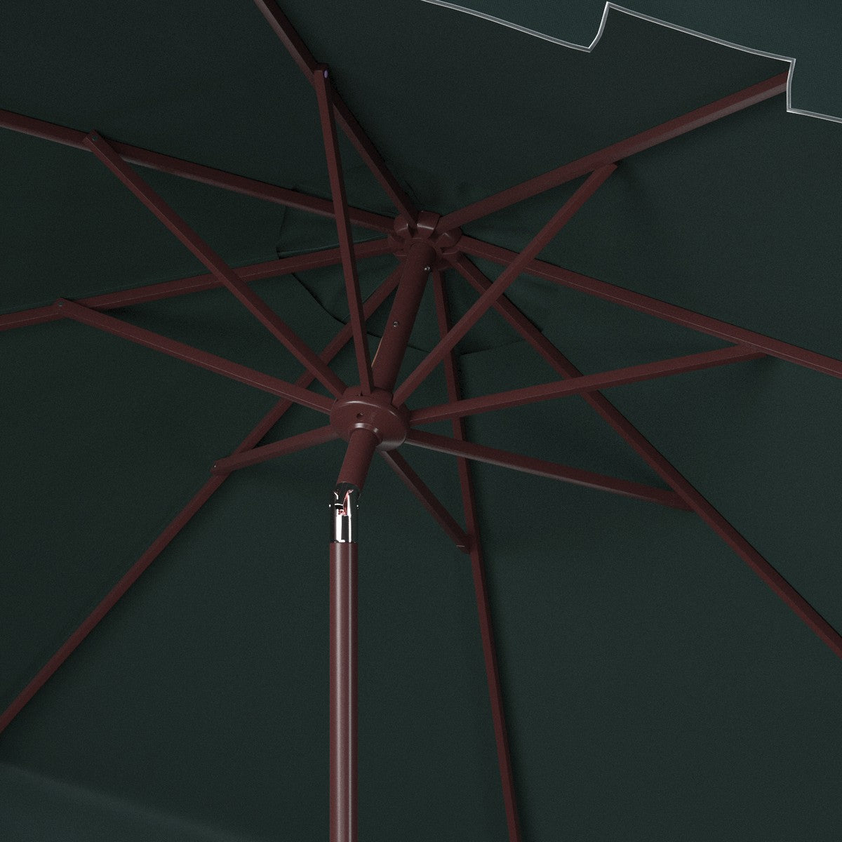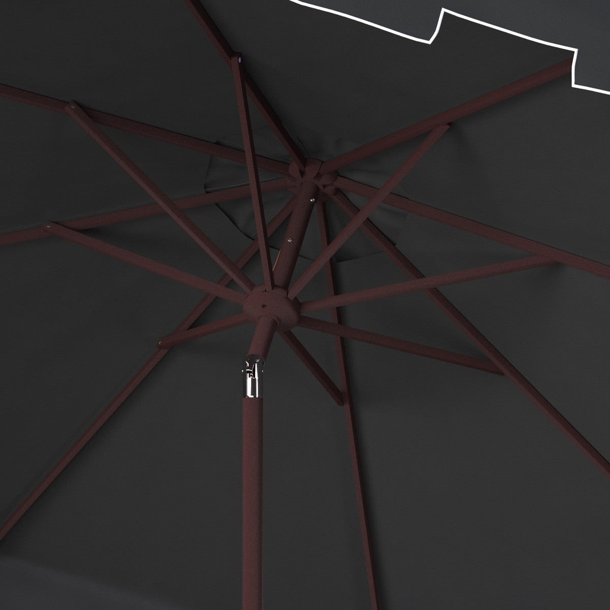 A classic market umbrella gets a chic makeover in forever fashionable black and white with a stylish valance for extra sun protection and European flair. Its round eleven foot polyester canopy and brown aluminum post make it ideal for the veranda or pool deck. Includes easy crank and tilt mechanism.