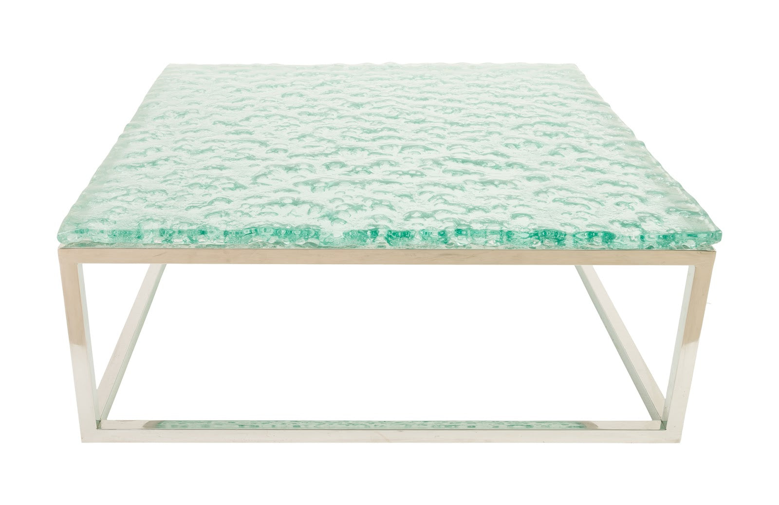 Made of glass with a turquoise sheen, the Bubble Glass Coffee Table is stamped with a flowing pattern that is created when molten glass is laid onto a surface covered with stones. The rocks create varying sizes of impressions that bring this glass coffee table its bubbly personality. The stainless-steel frame that supports the glass makes this a seamless design. A design aspect of note is how the bumpy surface of the bottom layer creates a textural feel even though the top surface is smooth. This contemporary coffee table perfectly reflects the ethos that the Phillips Collection personifies: modern organic. We offer a number of furnishings in the Bubble Glass family of products, including a console table.