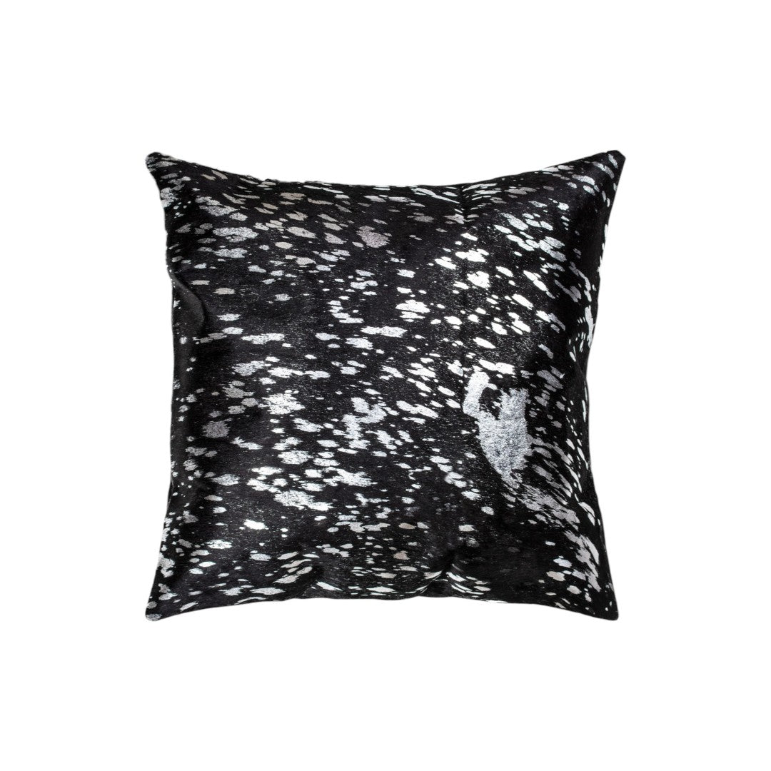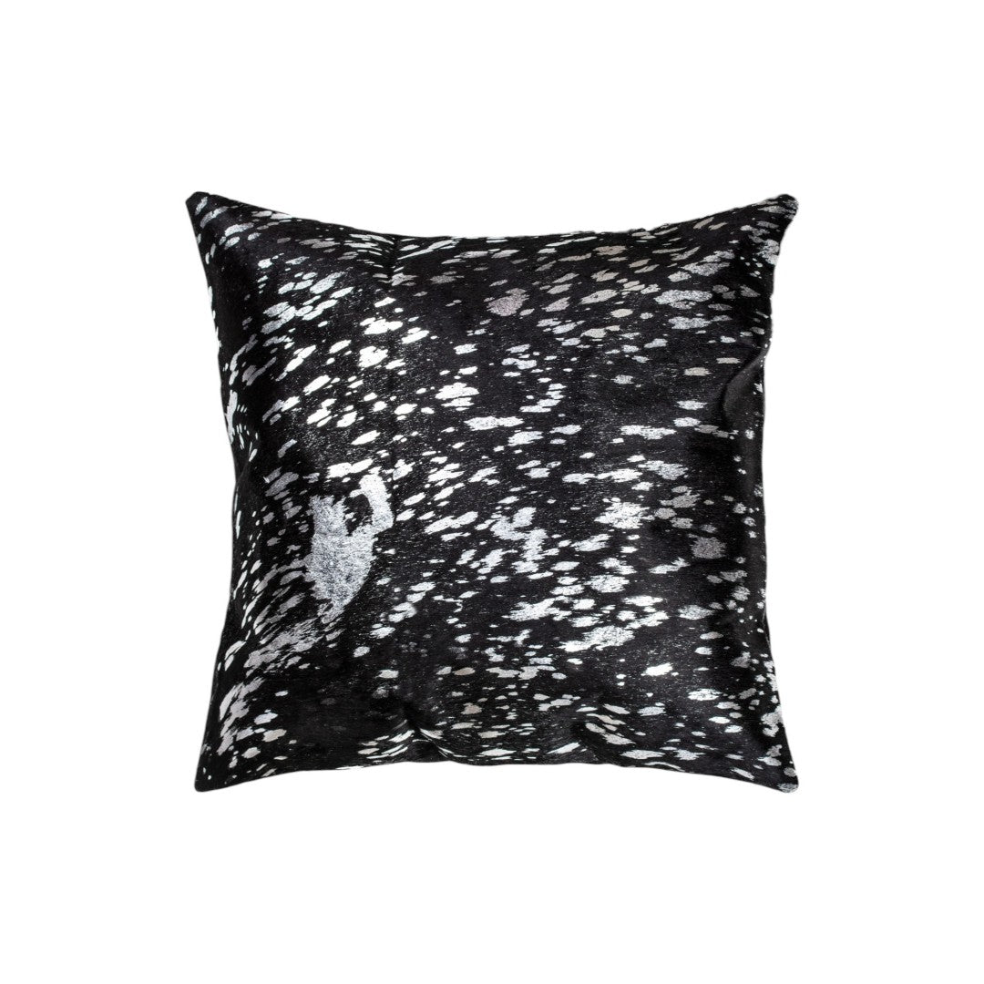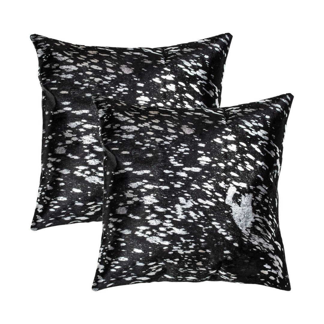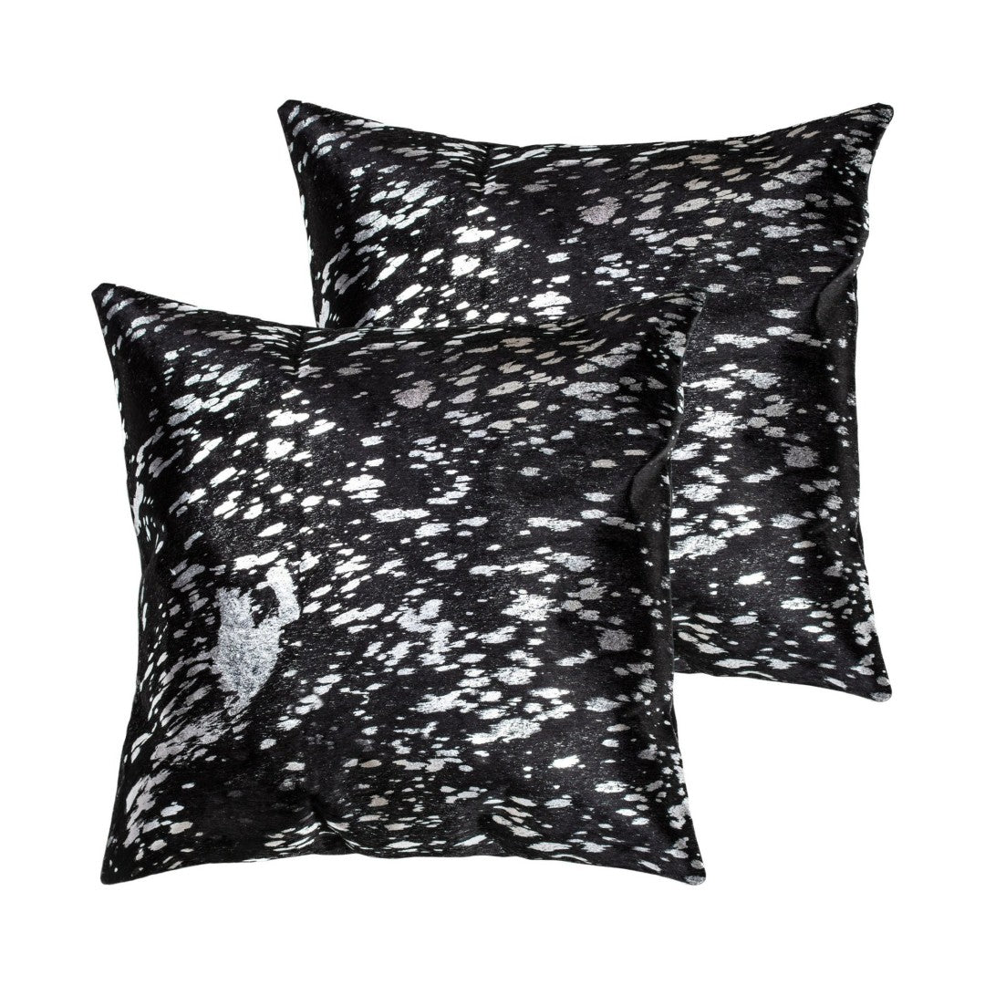 Elevate your living space with this luxurious set of two black and silver abstract cowhide throw pillows. Crafted from genuine cowhide with subtle glitter accents and a plush polyfill insert, these pillows combine tactile richness with contemporary glamour—perfect for sofas, armchairs, or layered on a bed to add instant texture and sparkle.