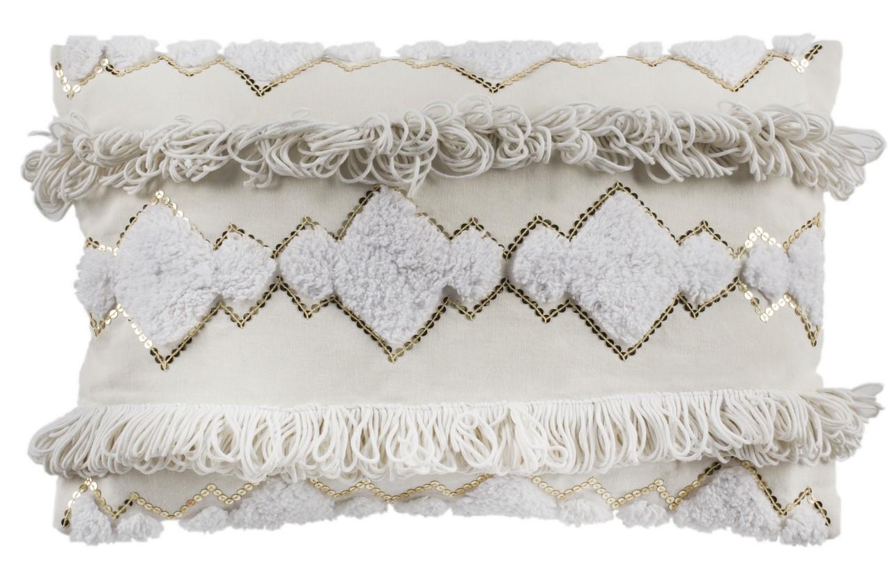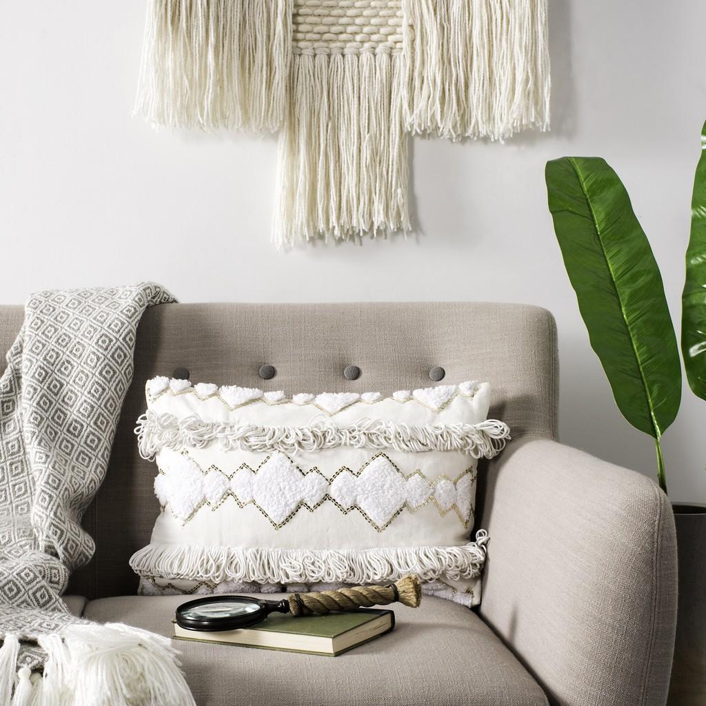 Pillows tend to flatten during transit, but these tips should help you get that pillow into its fluffiest shape quickly! Once unpacked, gently knead the pillow to help loosen the fibers. Throw the pillow in a dryer on a low tumble setting. The most important tip is to include a sock stuffed with a tennis ball to help "beat" the pillow into its fluffy form. Remove from the dryer, and proudly display your new piece of couch art!