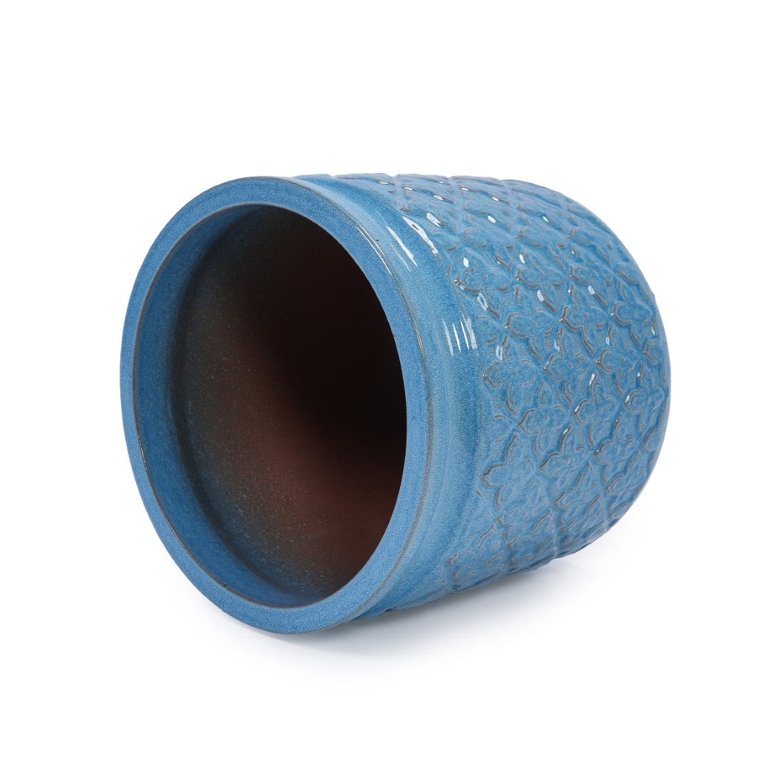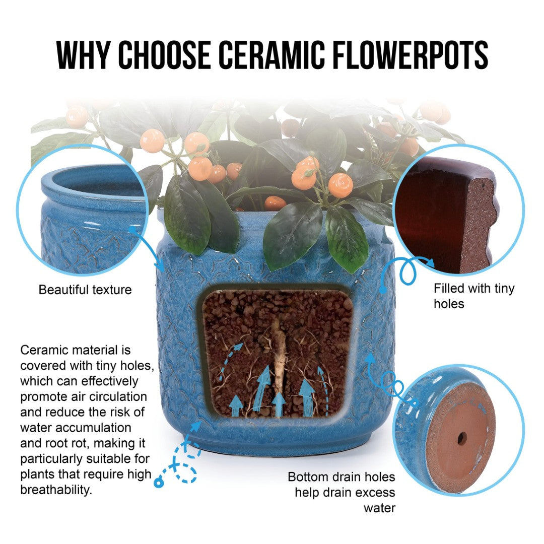 Bring a touch of artisan charm to your patio, windowsill, or garden with this elegant set of three antique-blue ceramic flowerpots. Each piece is precision-crafted from hand-carved prototypes and finished with skilled hand-glazing and high-temperature firing to ensure lasting beauty, consistent color, and durable performance outdoors or indoors.