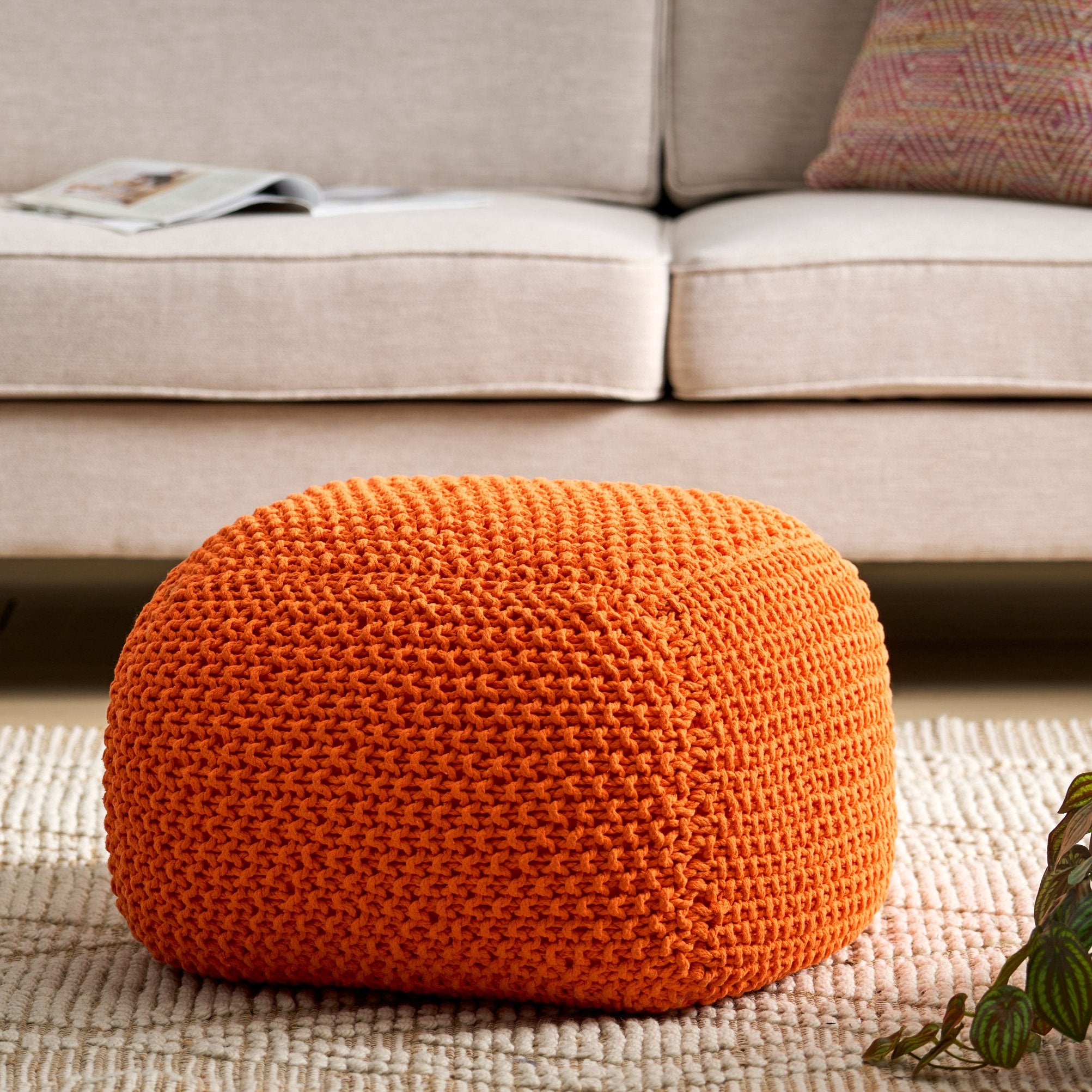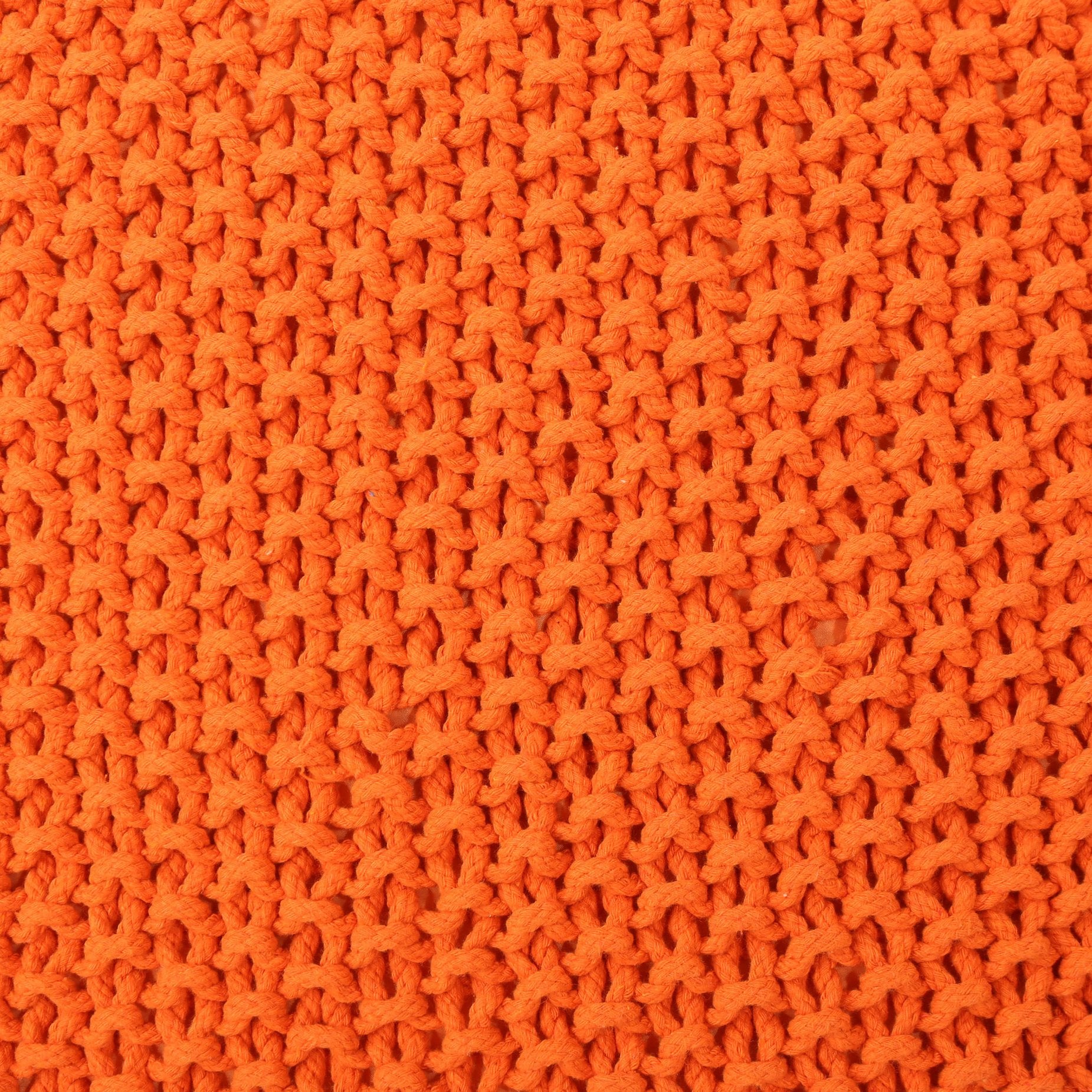 Add a warm, textured focal point to any room with this hand-crafted knitted cotton pouf. Soft yet supportive, its versatile cube shape works as extra seating, a footrest, or a casual side table in living rooms, bedrooms, nurseries, or reading nooks. The vibrant orange hue and artisanal knit detailing bring cozy, contemporary style to modern and boho interiors alike.
