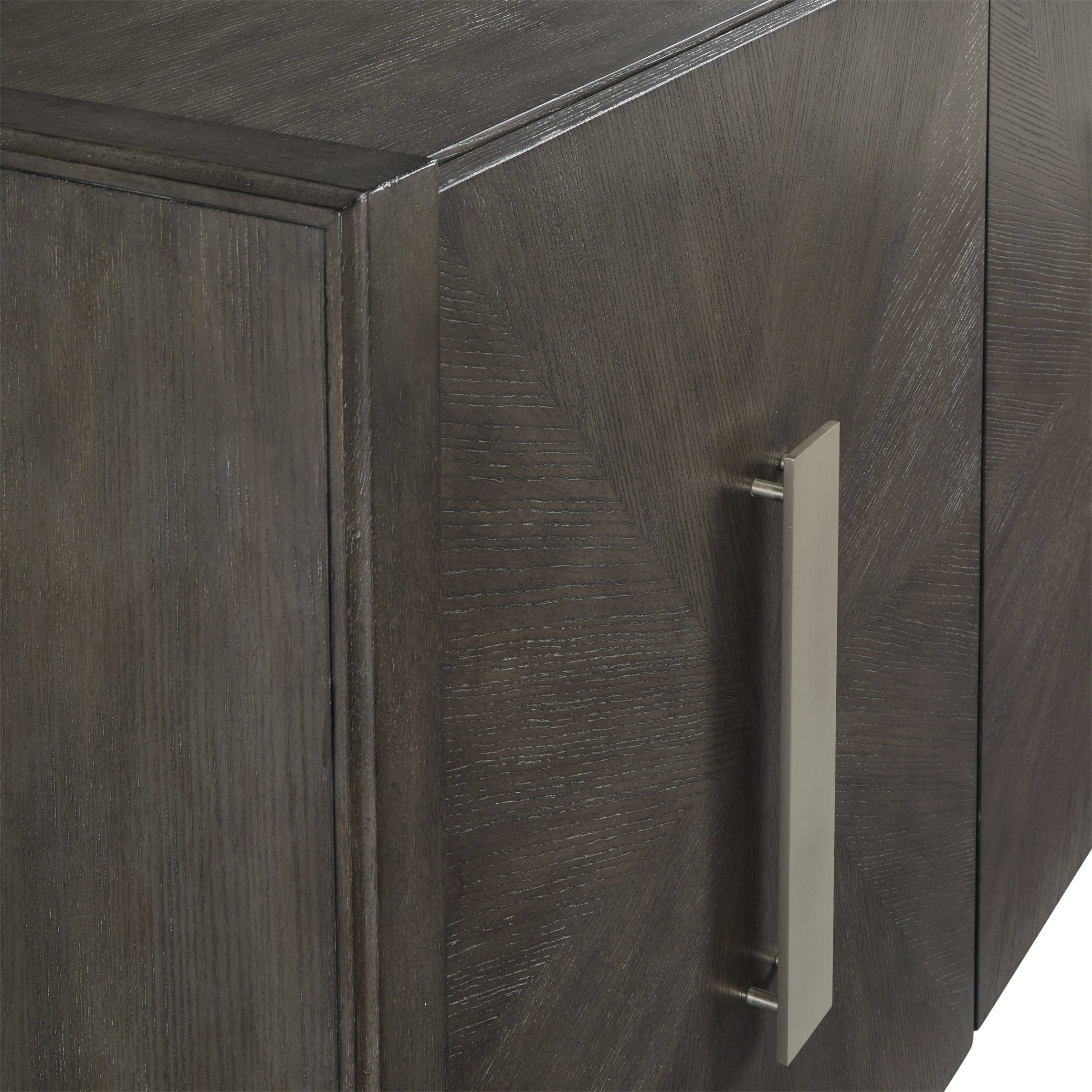- Custom hardware in a satin nickel finish adds a contemporary touch to the overall design