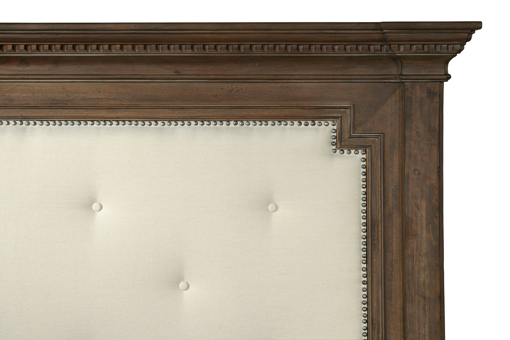 - Upholstered with a full-bodied, heavy-weight beach sand colored linen and button tufting framed with decorative nailhead trim.