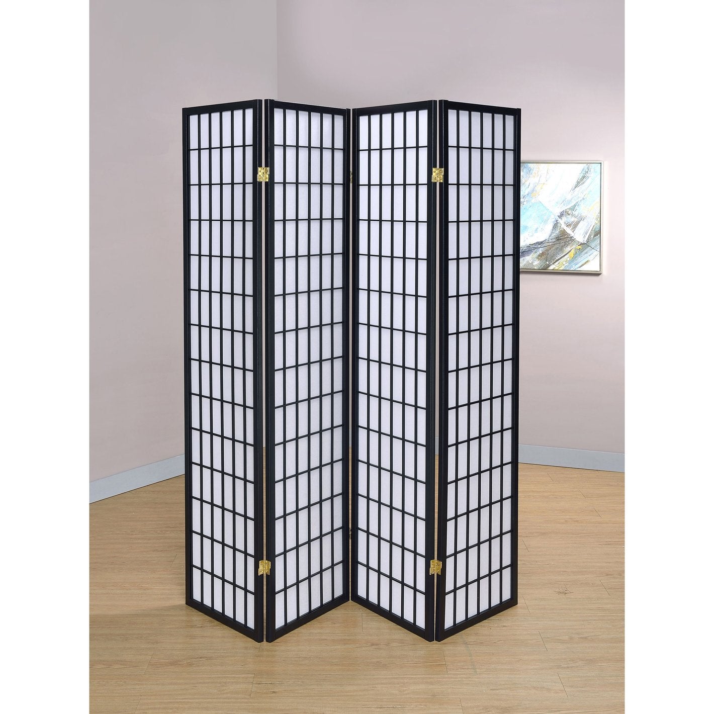 Add instant privacy and sophisticated style with this four-panel folding shoji screen. Its sleek black frame and translucent white panels create a modern, minimalist backdrop that gently diffuses light while dividing rooms, dressing areas, or creating cozy nooks. Built for easy use and lasting appeal, the Sartre screen blends traditional shoji aesthetics with contemporary materials to complement a wide range of interiors.