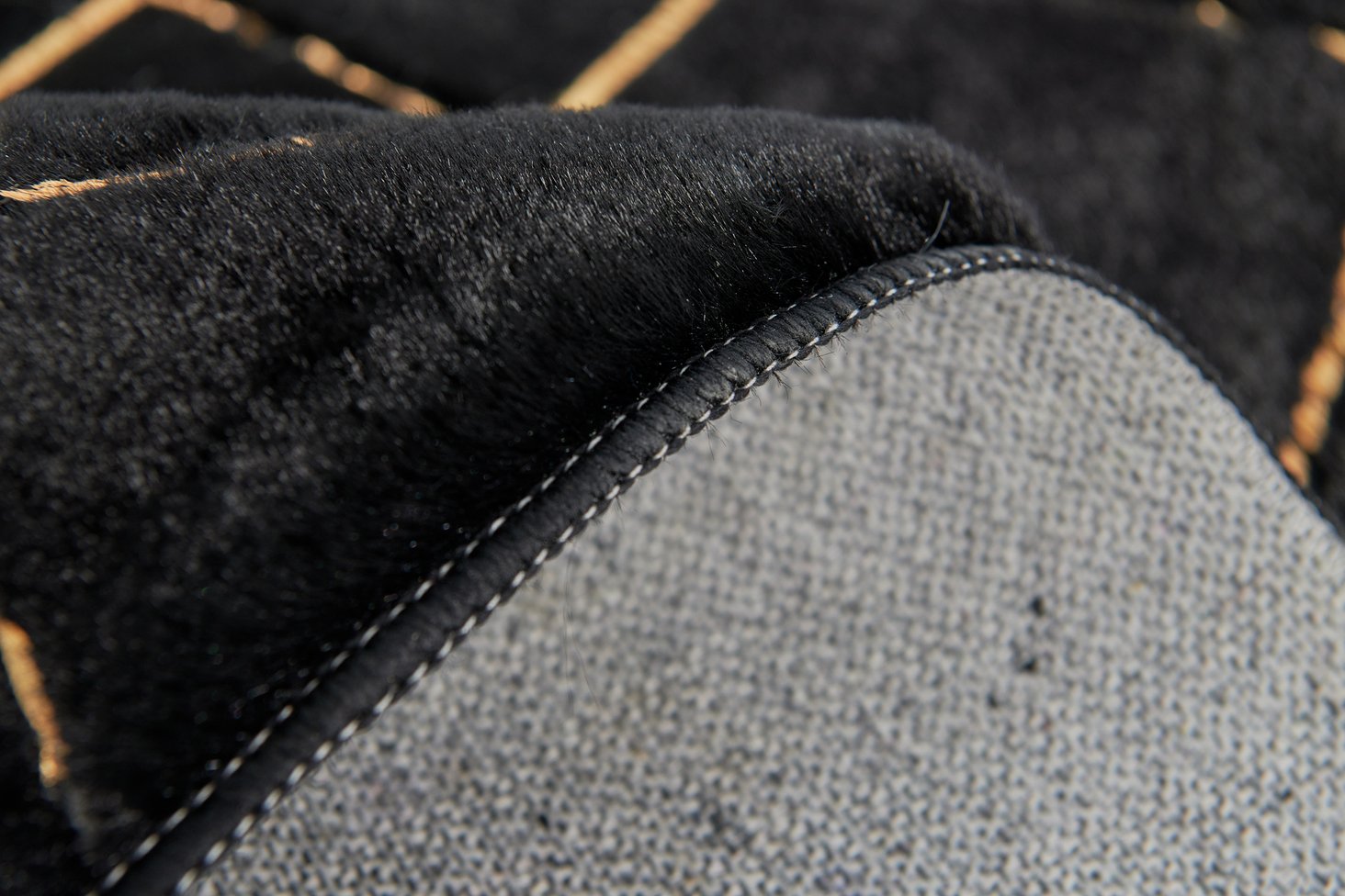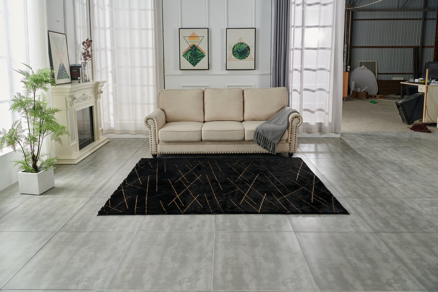 - Introducing Machine Washable Chinchilla-like Faux Fur Black Pink Area Rug. Beautiful contemporary Geometric Abstract Design. Made of soft and plush polyester, this rug features a scratch-resistant anti-slip rubber backing that's perfect for any types floors. The golden accent patterns give it a premium appeal, while its soothing tone creates a cozy and inviting atmosphere. This cozy rug looks perfect in your living room, bedroom, dining room or family room where you relax after a hectic day.