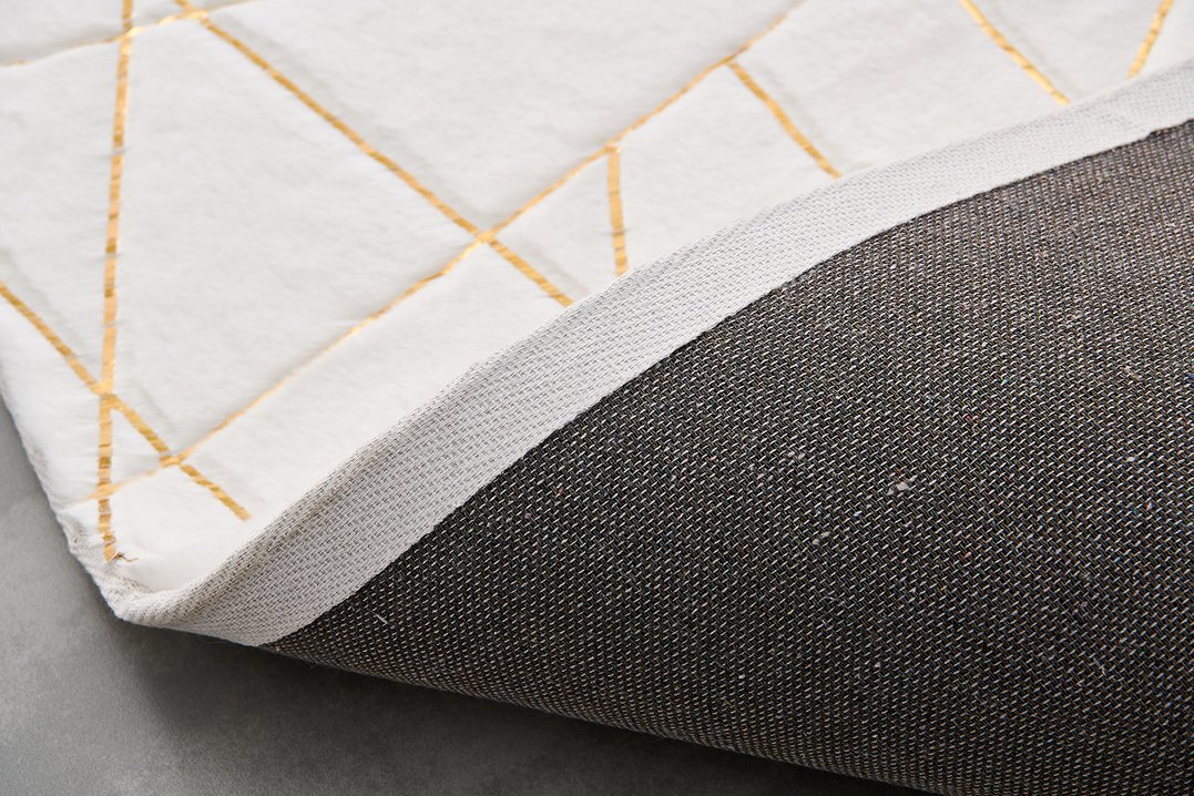 - Introducing Machine Washable Chinchilla-like Faux Fur White Pink Area Rug. Beautiful contemporary Geometric Abstract Design. Made of soft and plush polyester, this rug features a scratch-resistant anti-slip rubber backing that's perfect for any types floors. The golden accent patterns give it a premium appeal, while its soothing tone creates a cozy and inviting atmosphere. This cozy rug looks perfect in your living room, bedroom, dining room or family room where you relax after a hectic day.