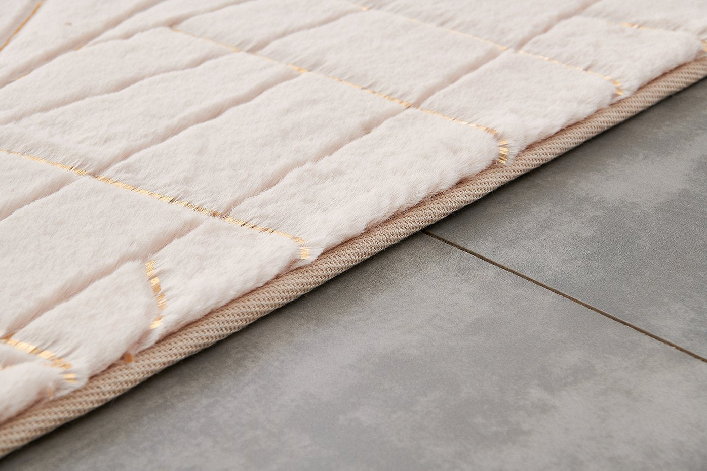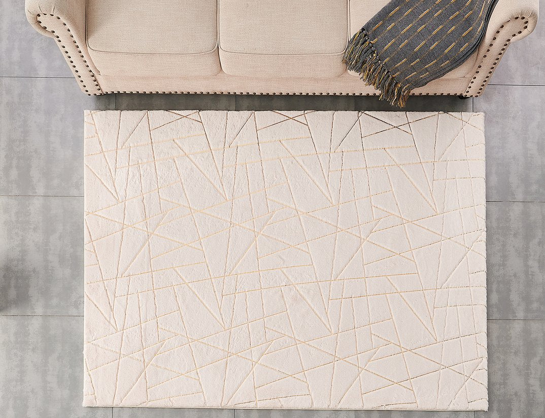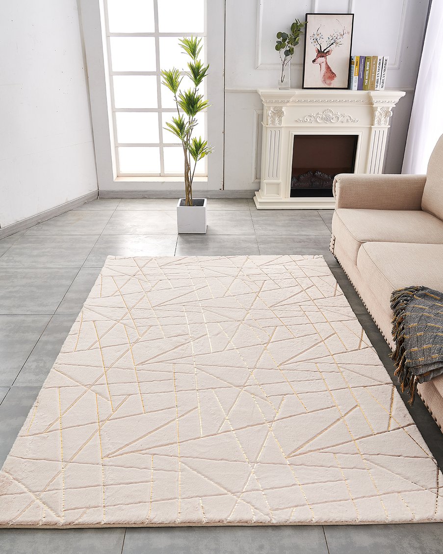 - Introducing Machine Washable Chinchilla-like Faux Fur Beige Area Rug. Beautiful contemporary Geometric Abstract Design. Made of soft and plush polyester, this rug features a scratch-resistant anti-slip rubber backing that's perfect for any types floors. The golden accent patterns give it a premium appeal, while its soothing tone creates a cozy and inviting atmosphere. This cozy rug looks perfect in your living room, bedroom, dining room or family room where you relax after a hectic day.