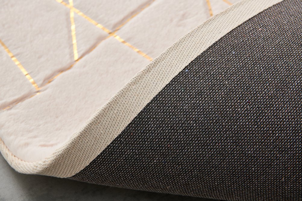 - Introducing Machine Washable Chinchilla-like Faux Fur Beige Area Rug. Beautiful contemporary Geometric Abstract Design. Made of soft and plush polyester, this rug features a scratch-resistant anti-slip rubber backing that's perfect for any types floors. The golden accent patterns give it a premium appeal, while its soothing tone creates a cozy and inviting atmosphere. This cozy rug looks perfect in your living room, bedroom, dining room or family room where you relax after a hectic day.