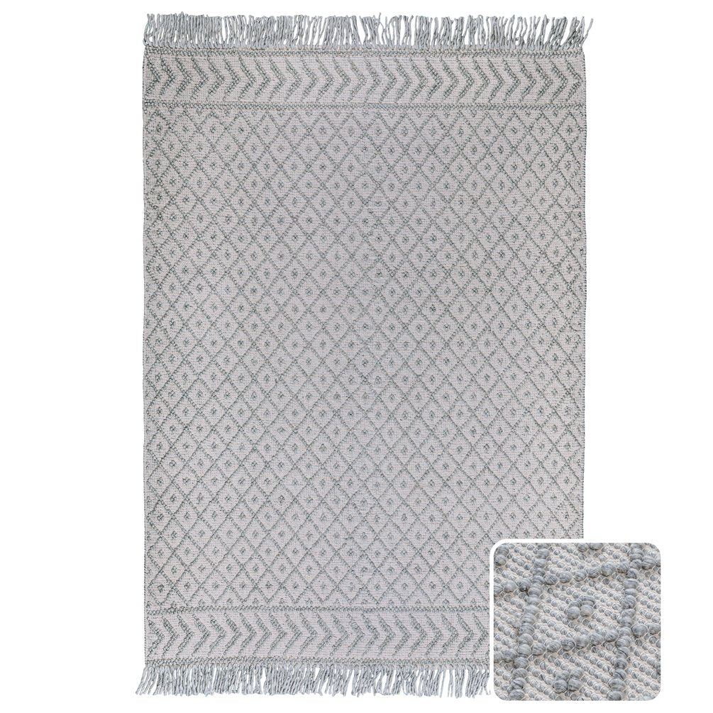 - Detailed with a geometric pattern in silver grey featuring a hand-knotted fringe
