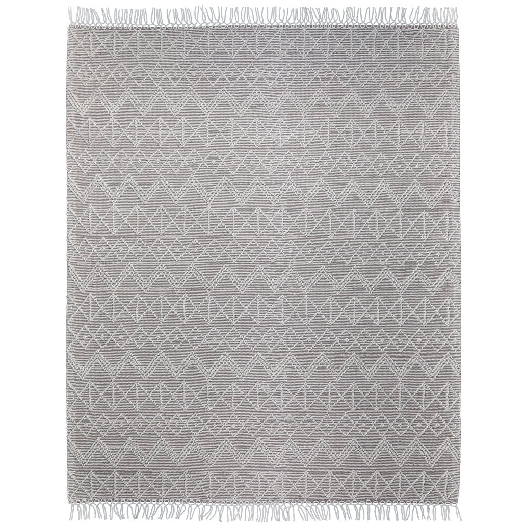 - Detailed with a geometric pattern in ivory and taupe featuring a hand-knotted fringe
