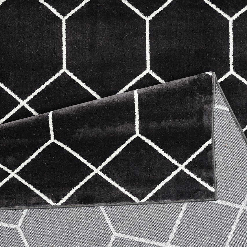 - Geometric trellis design in contrasting shades of black and cream