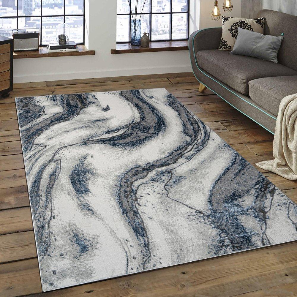 - Design: Abstract blue and grey pattern that complements modern, transitional, and coastal interiors