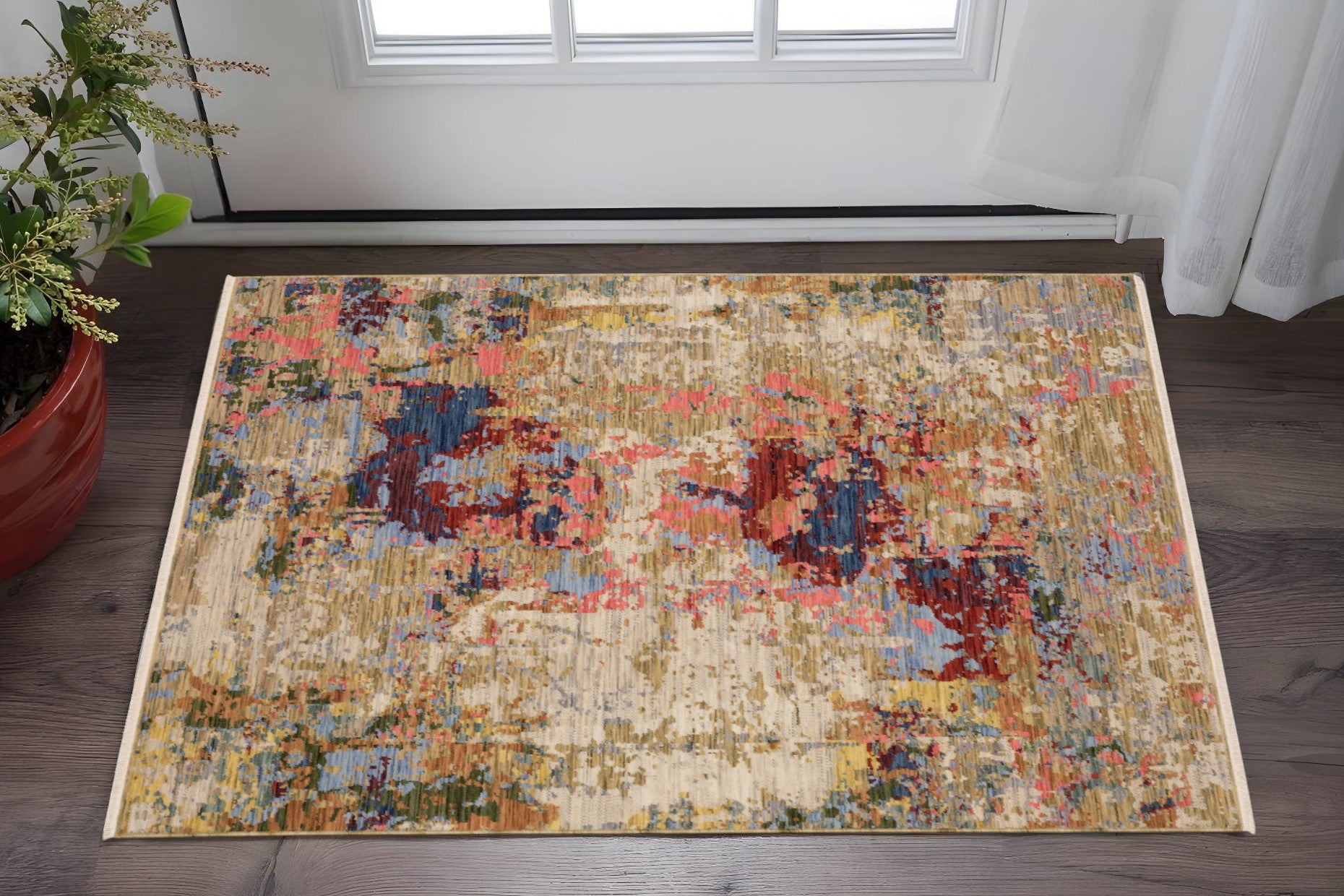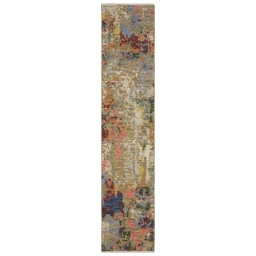 - Modern wool blend area rug in beige, salmon, and yellow color palette.