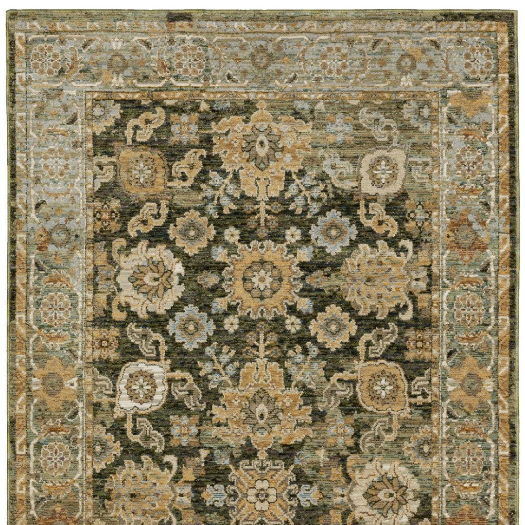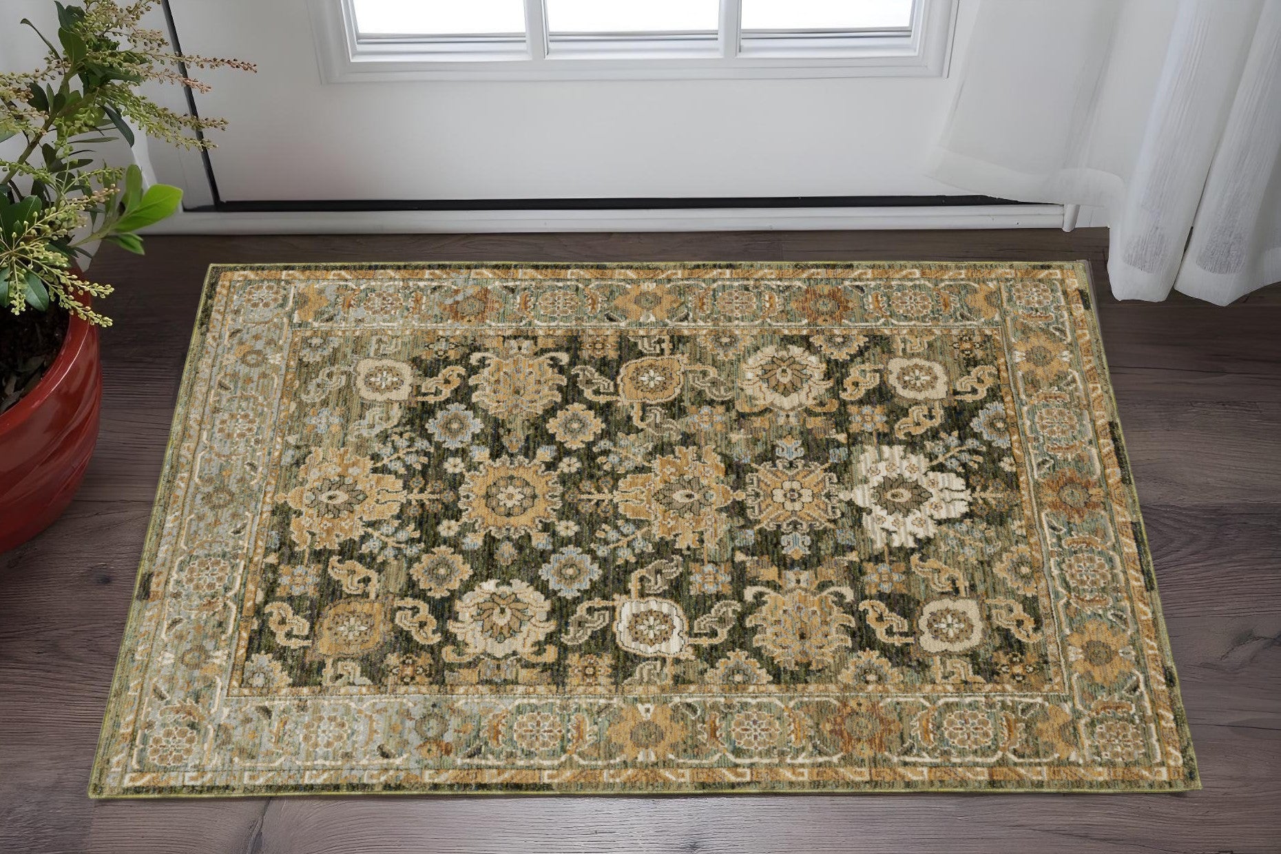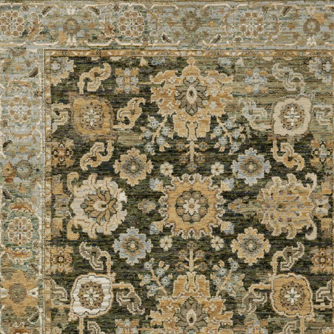 - traditional green and gold area rug, easy to care for with vacuum without beater bar.