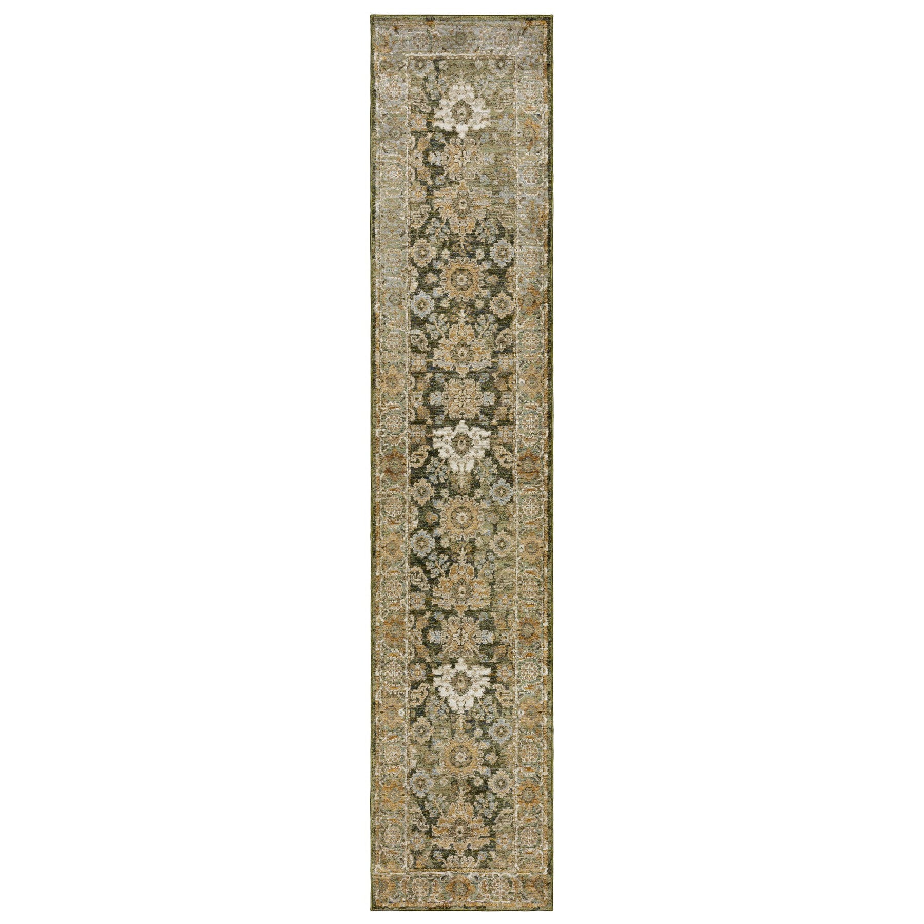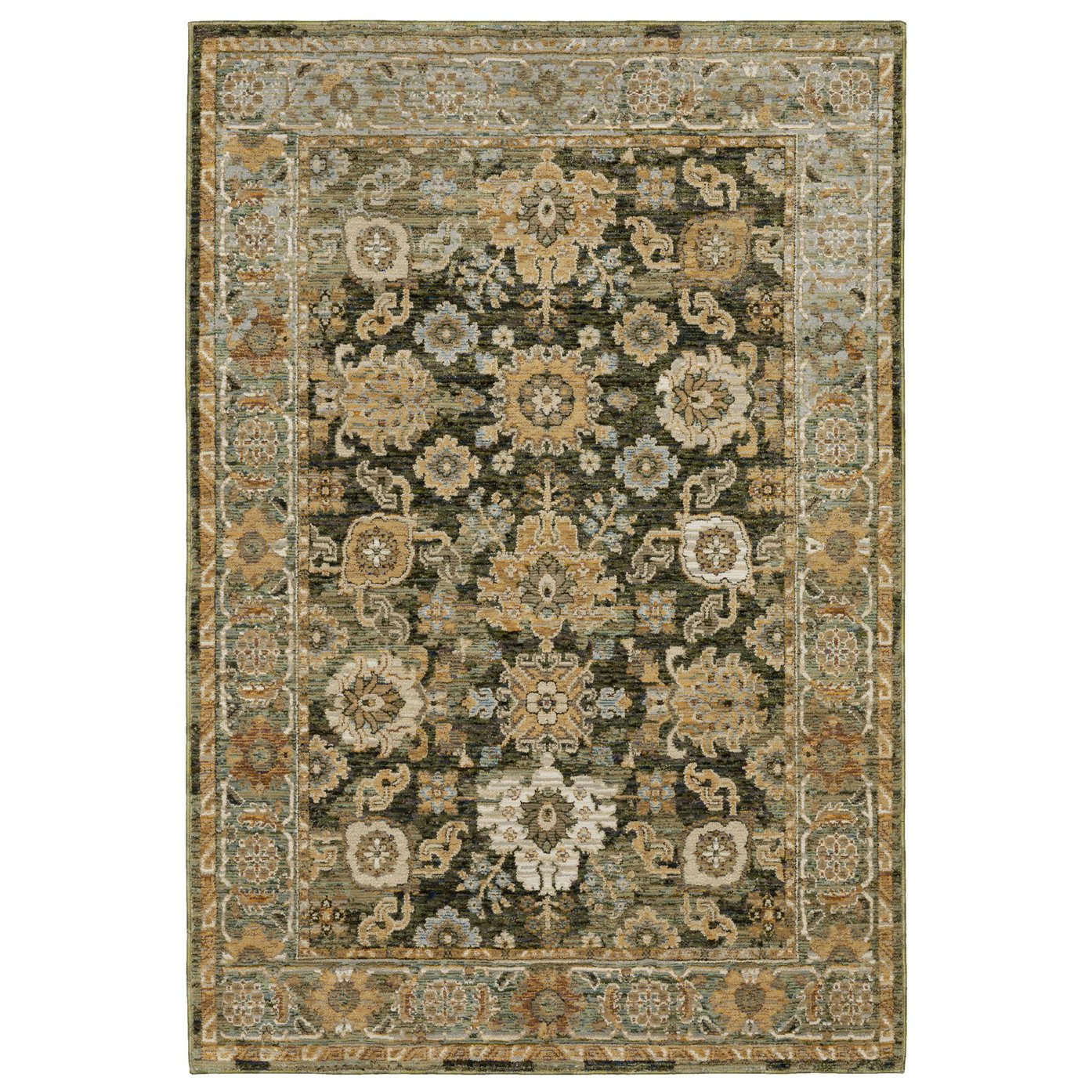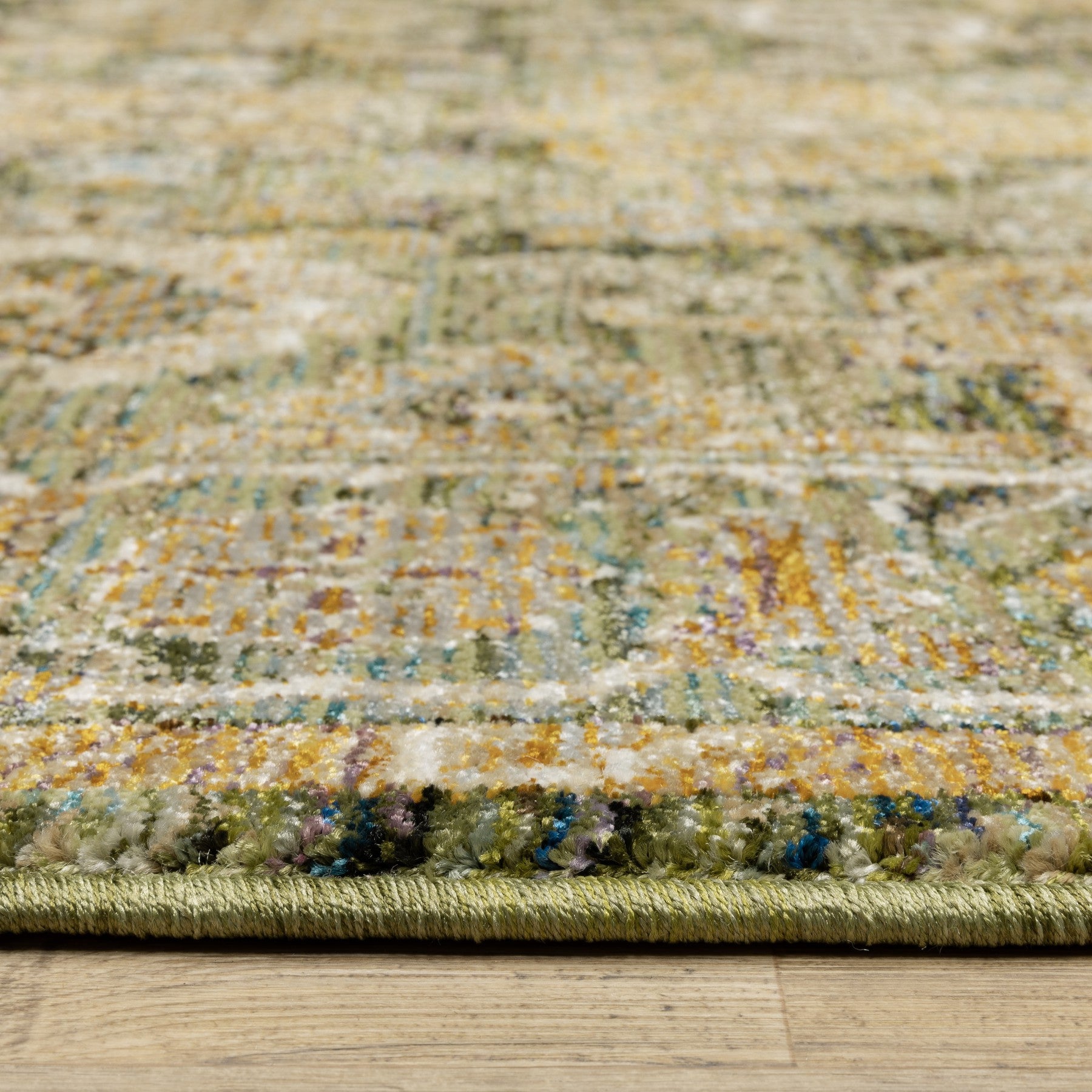 - traditional green and gold area rug, easy to care for with vacuum without beater bar.