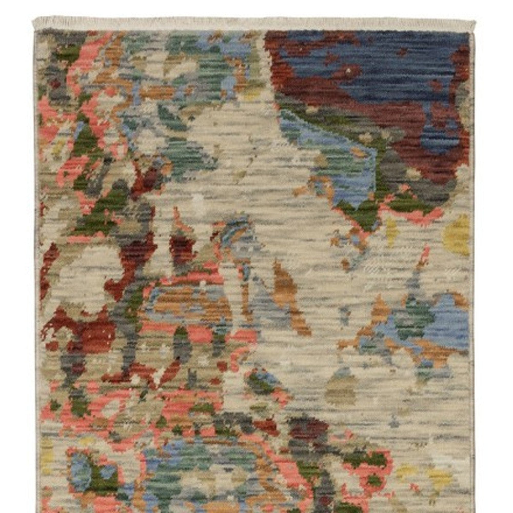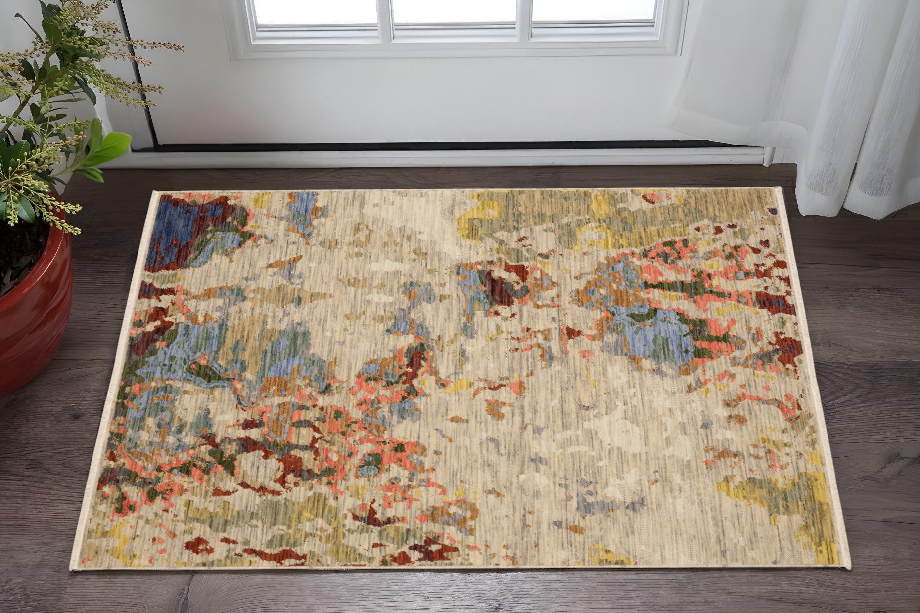 - Modern style machine-made area rug in beige, pink, and yellow wool blend for entry room.