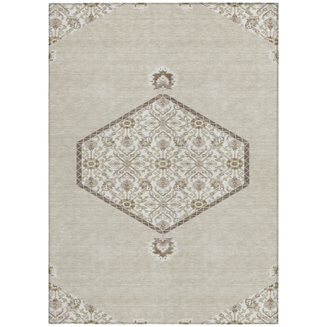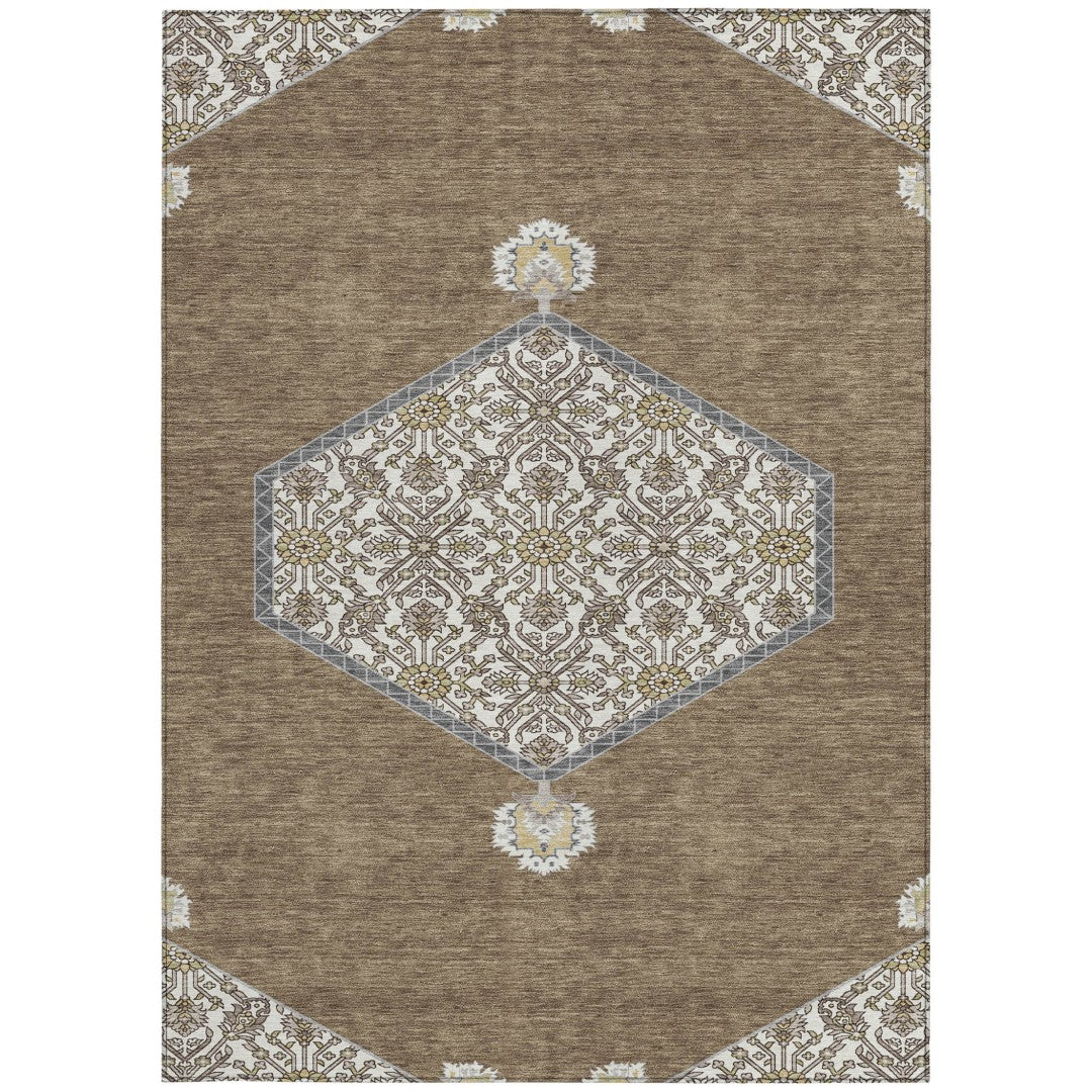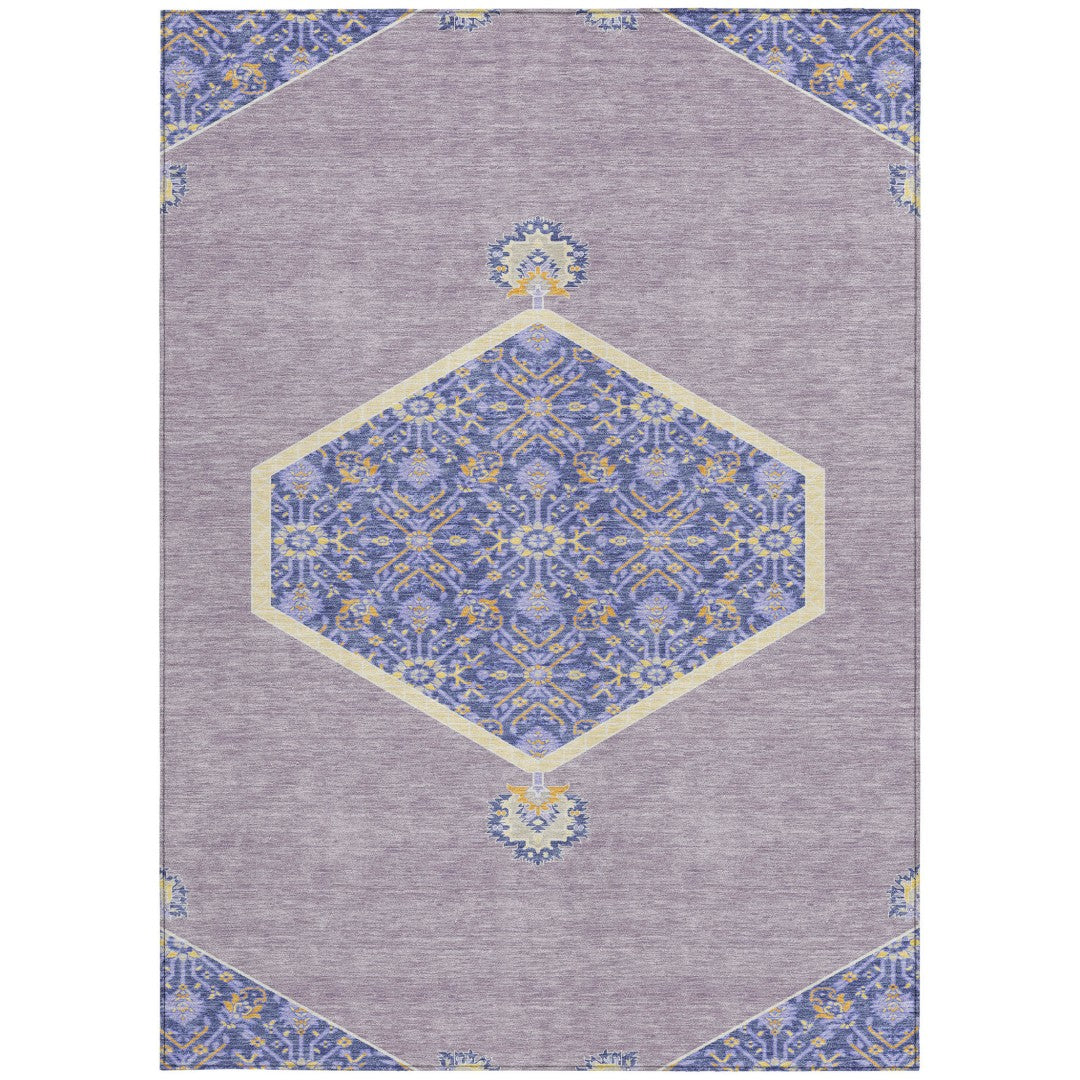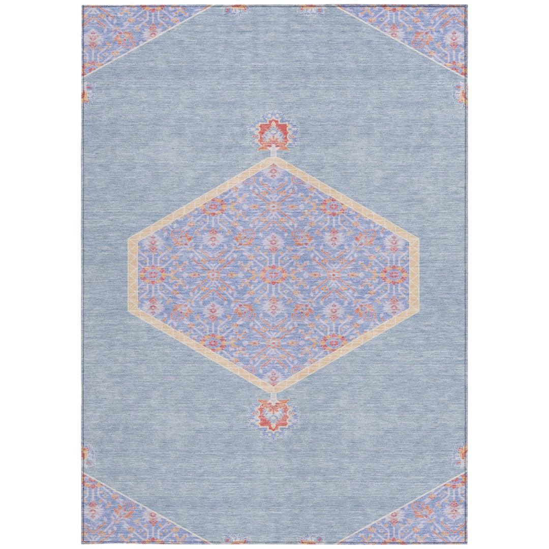 - Machine-made polyester outdoor rug with stain-resistant properties.