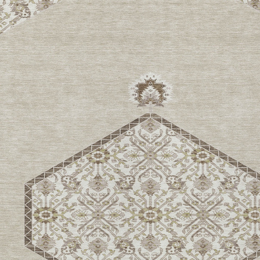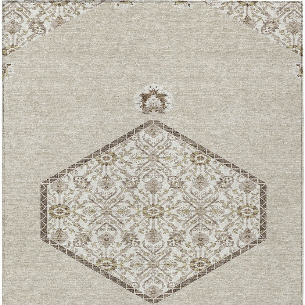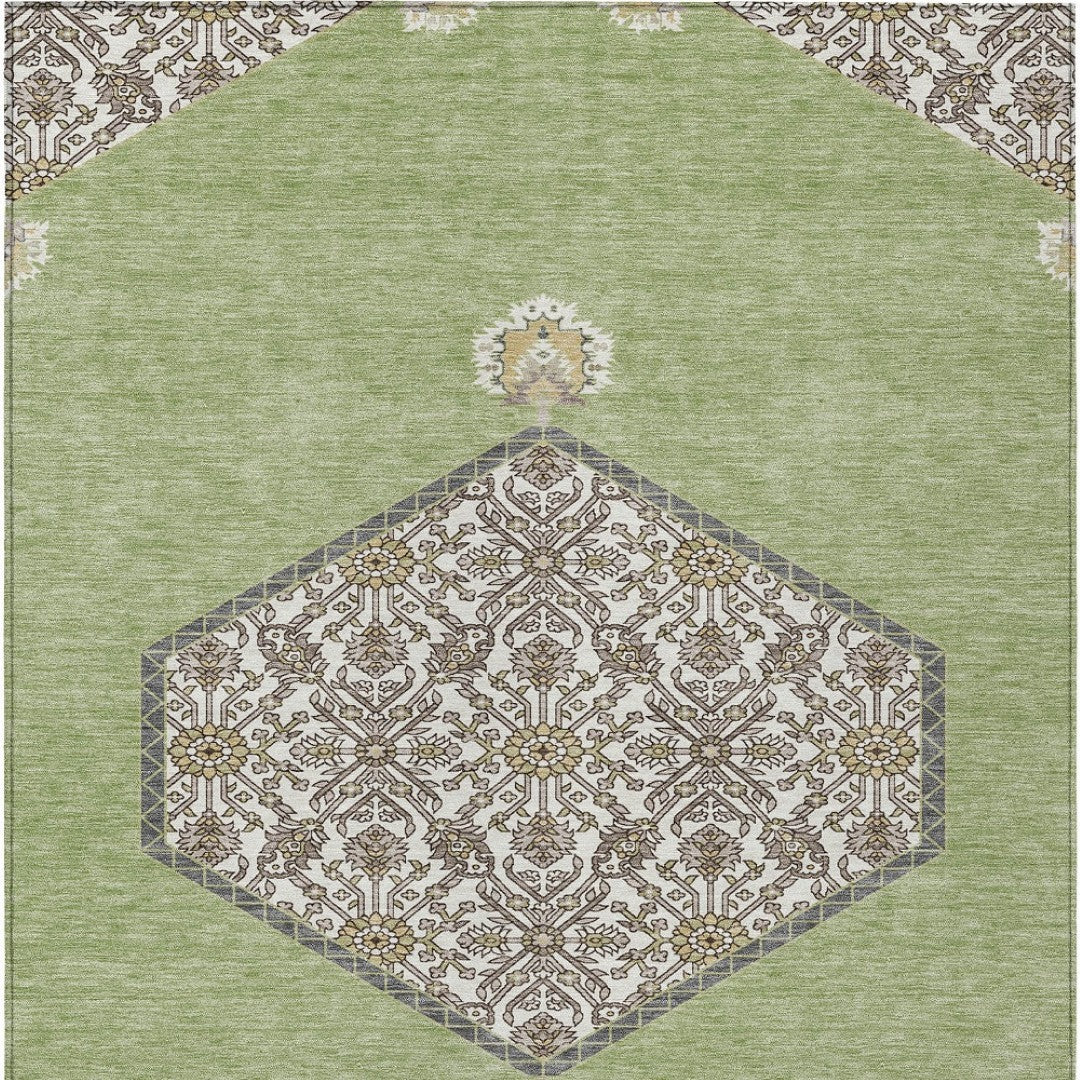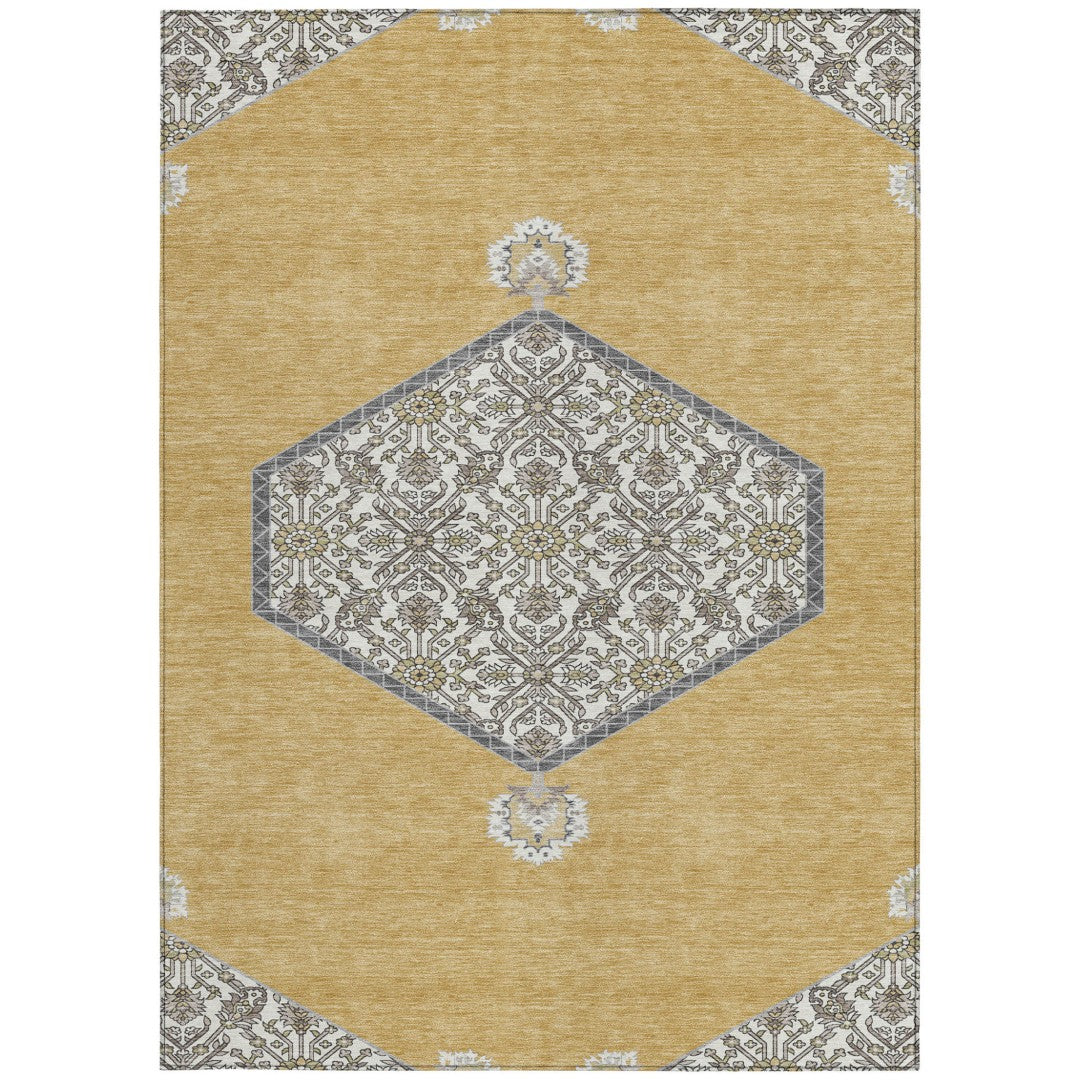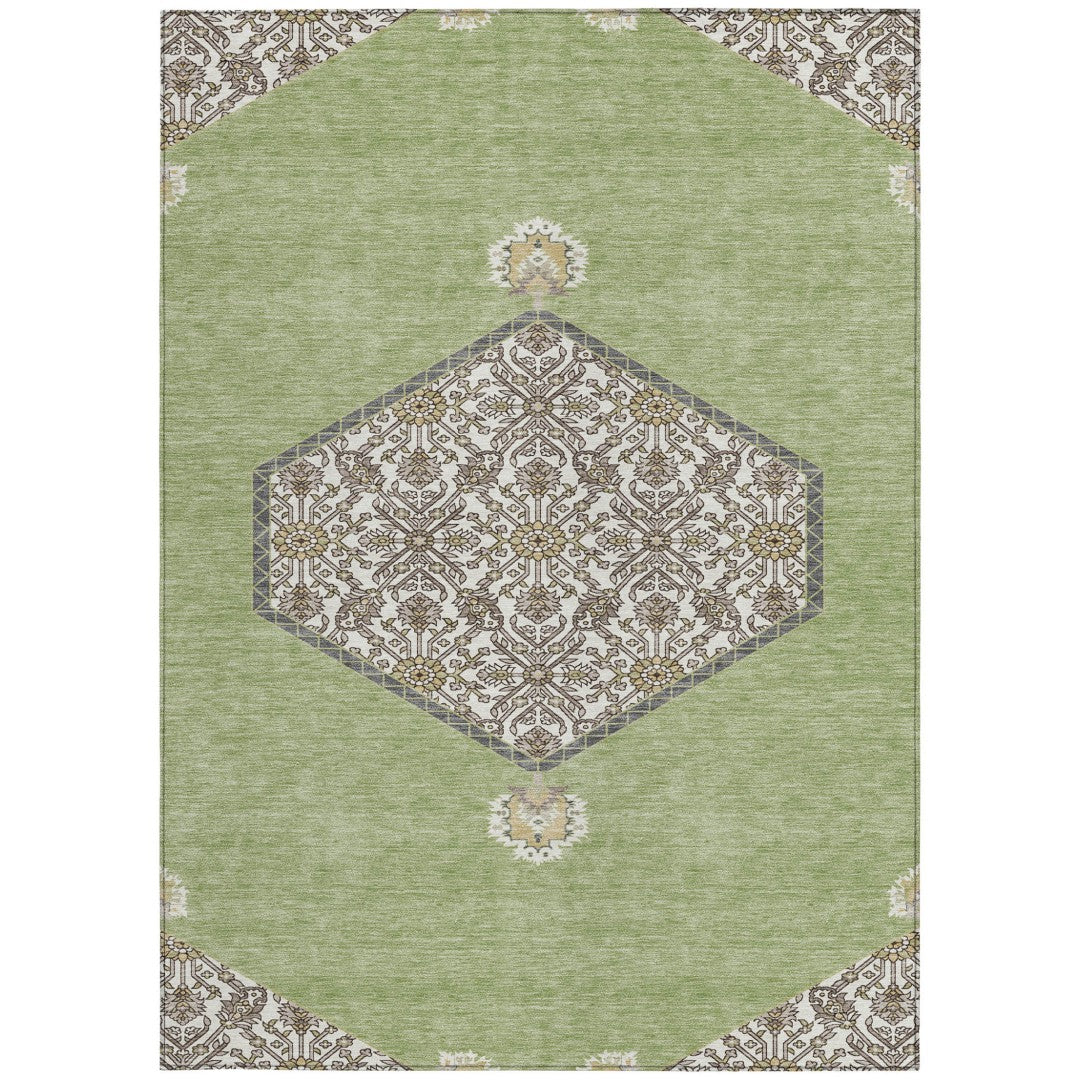 - Machine-made polyester outdoor rug with stain-resistant properties.