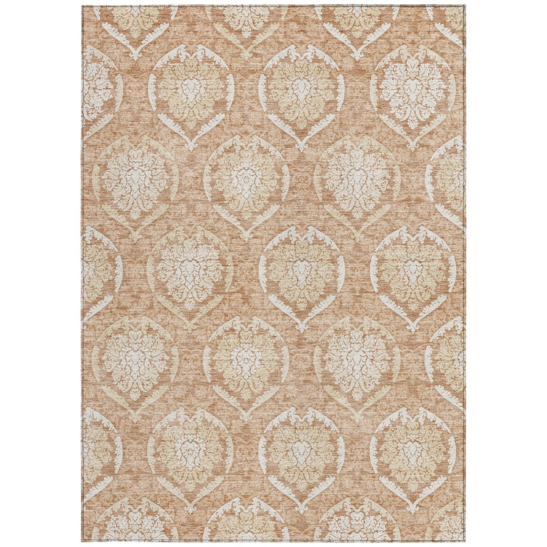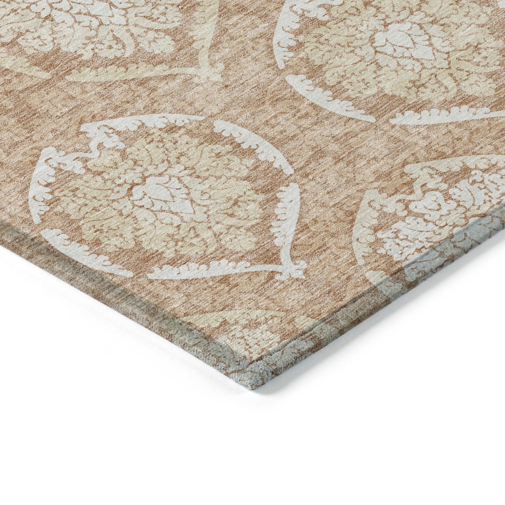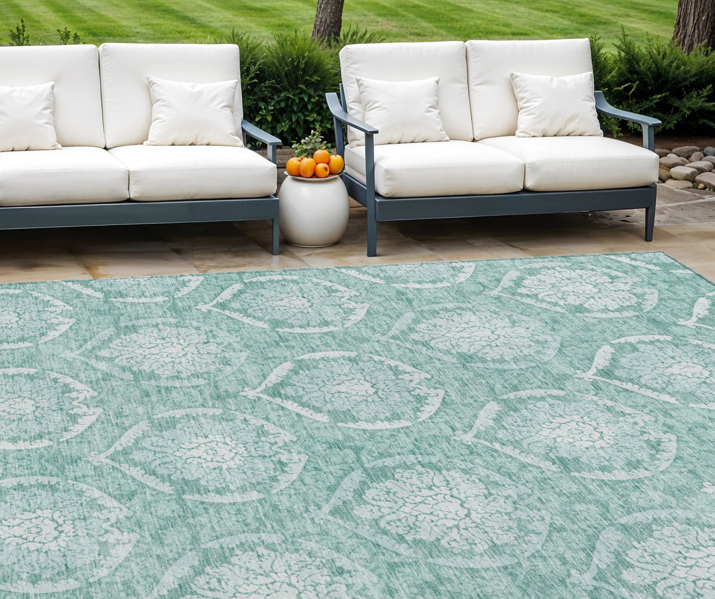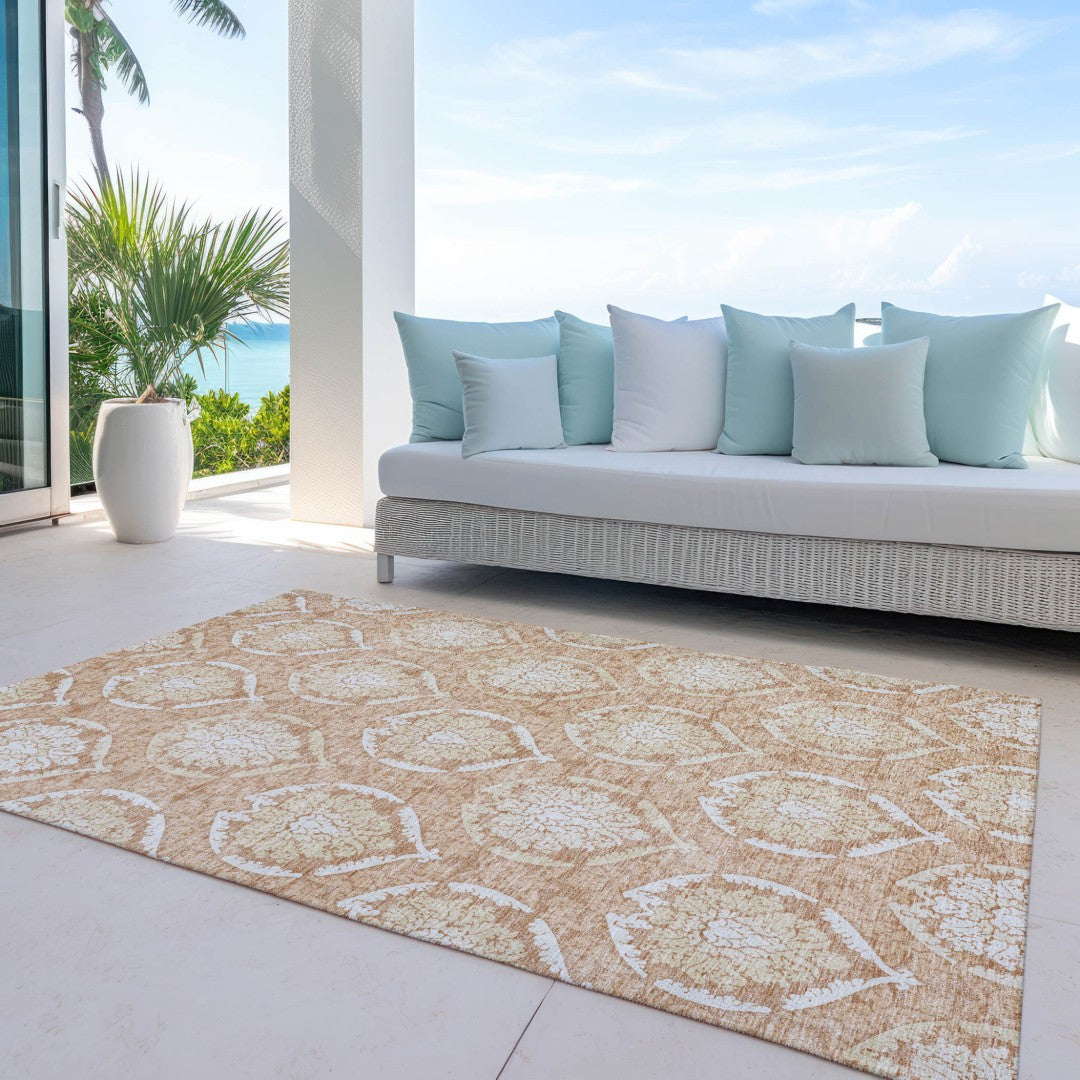 - Machine made outdoor rug with stain-resistant polyester material.