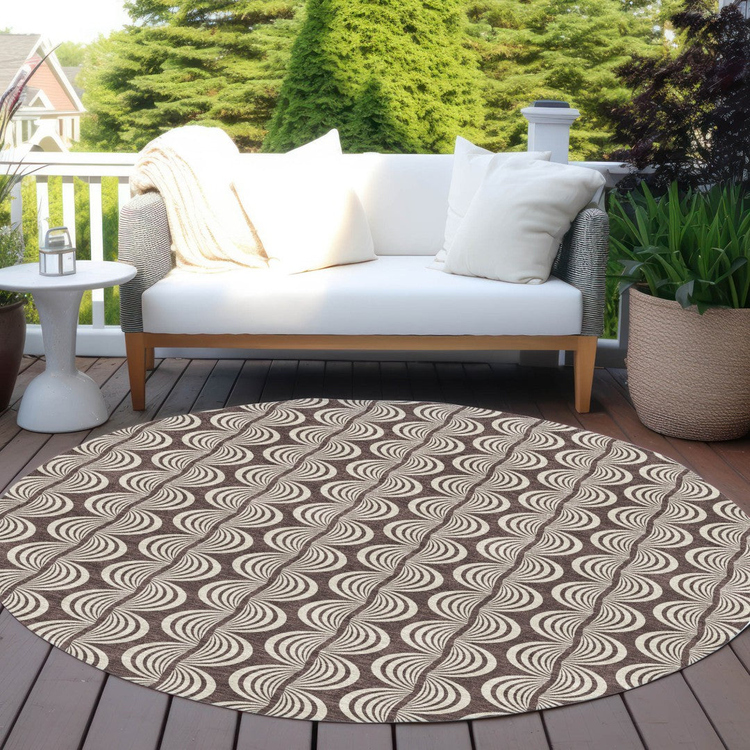 - Crafted from durable polyester, this stain resistant outdoor rug features a stylish copper and beige color scheme that enhances any space.