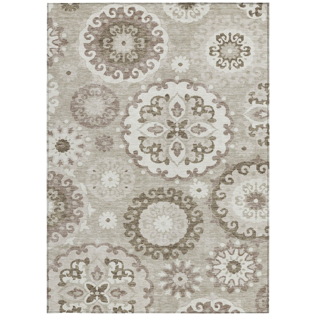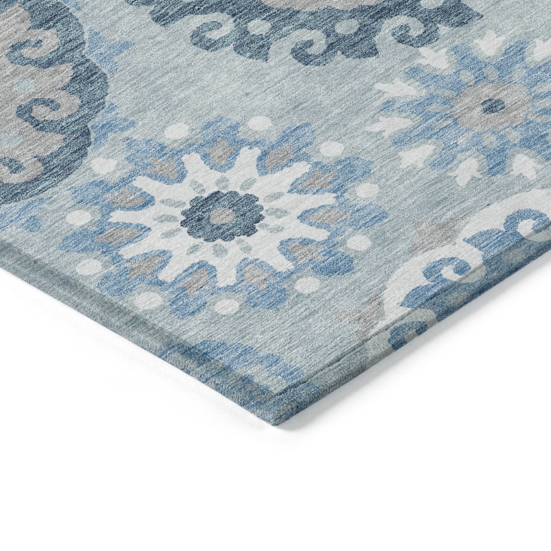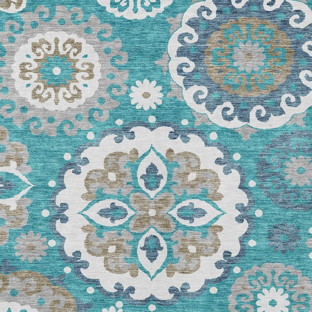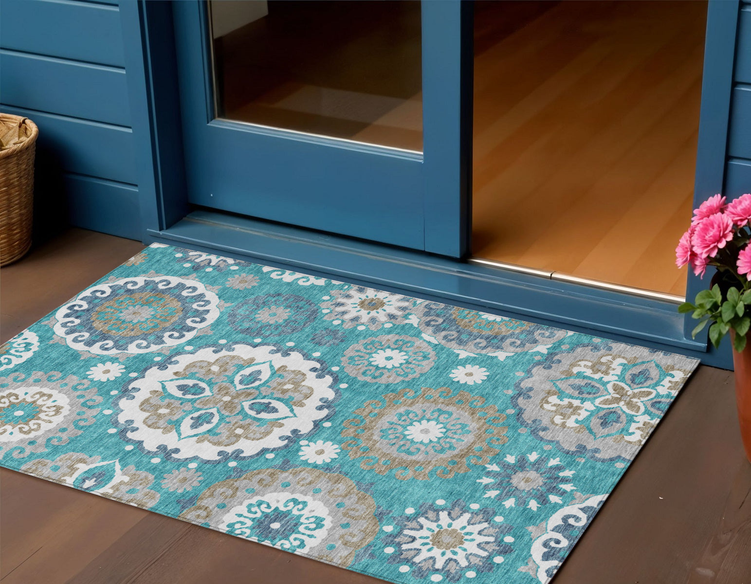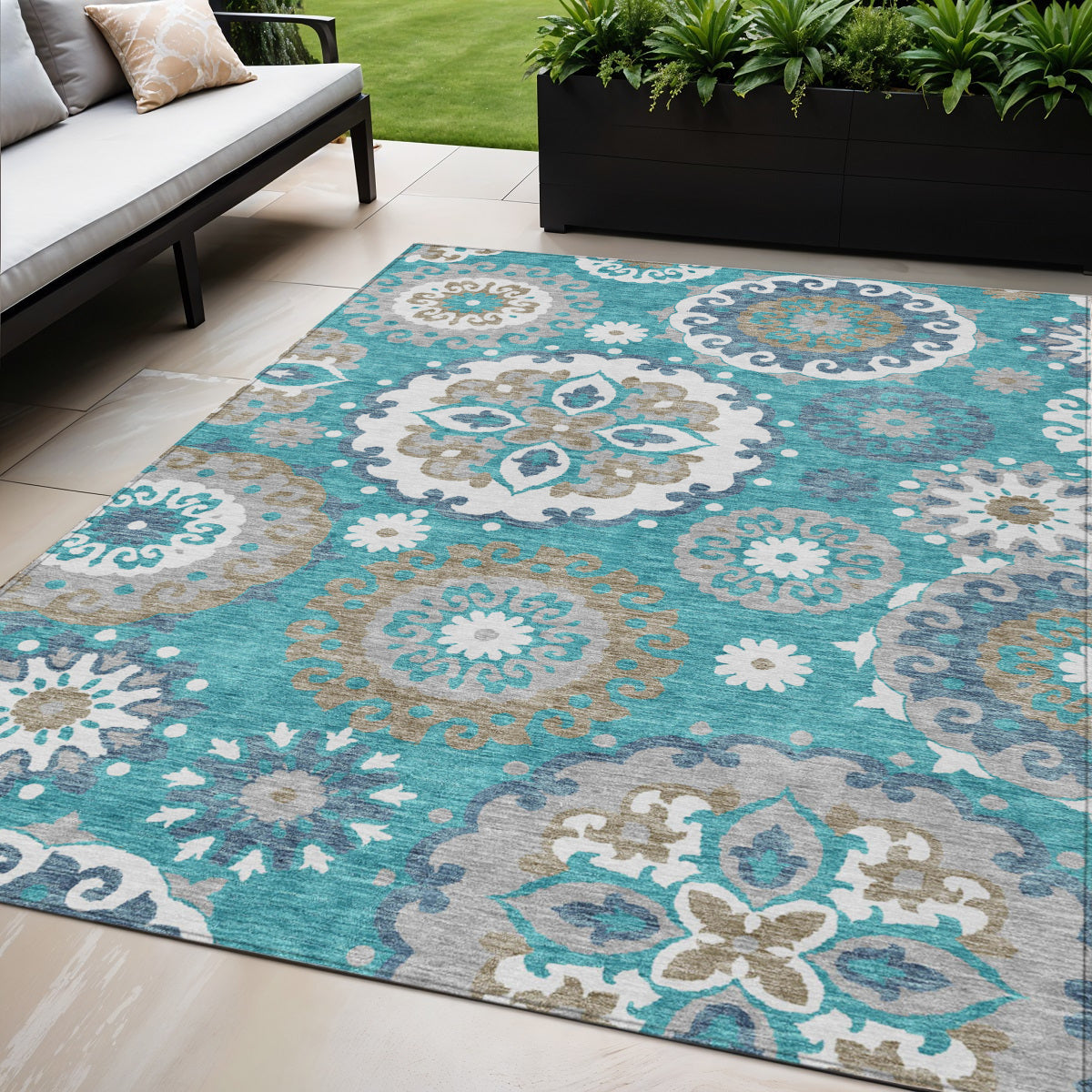 - Machine made outdoor rug with stain-resistant polyester material in teal blue, taupe, and gray colors.