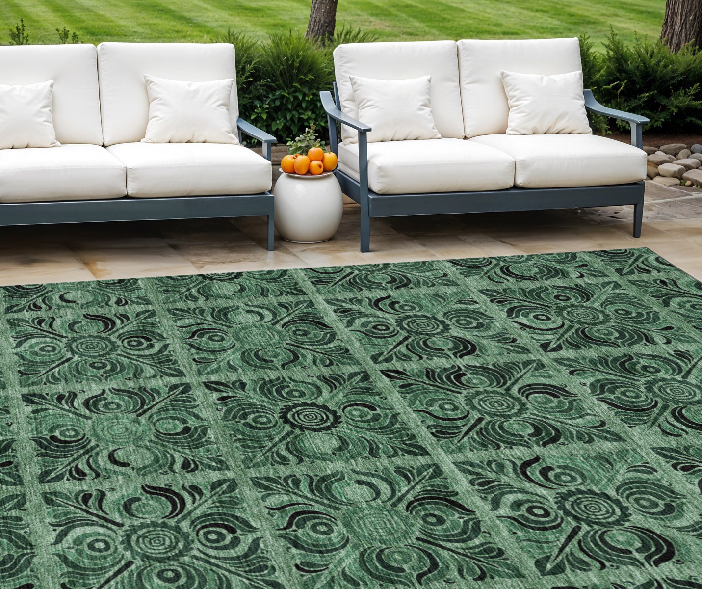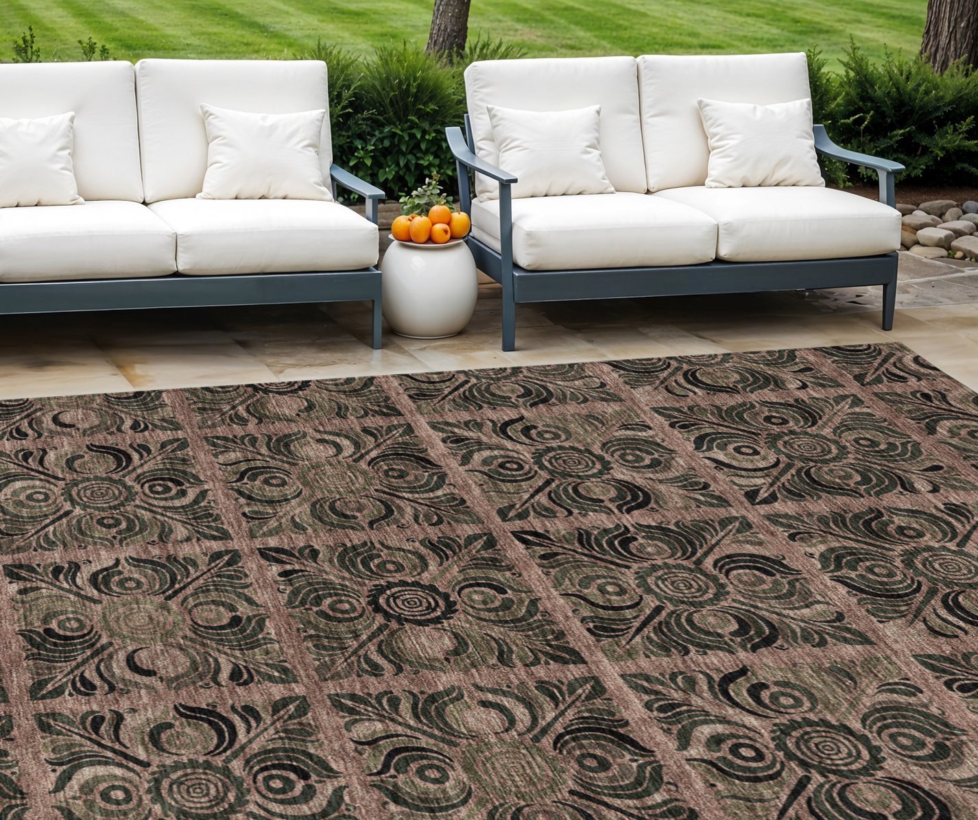 - Machine-made outdoor rug with stain-resistant and non-slip backing for easy maintenance.