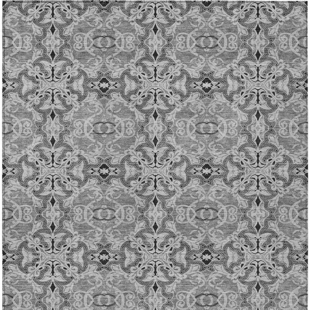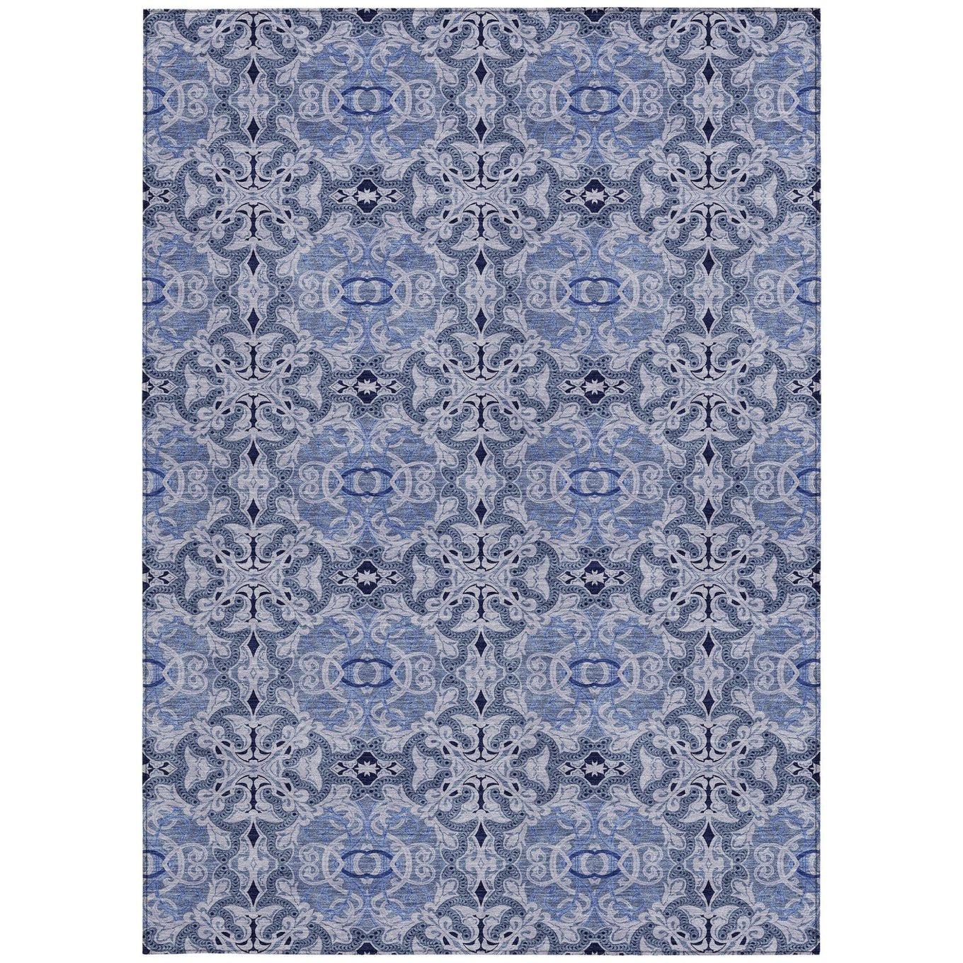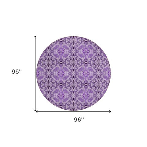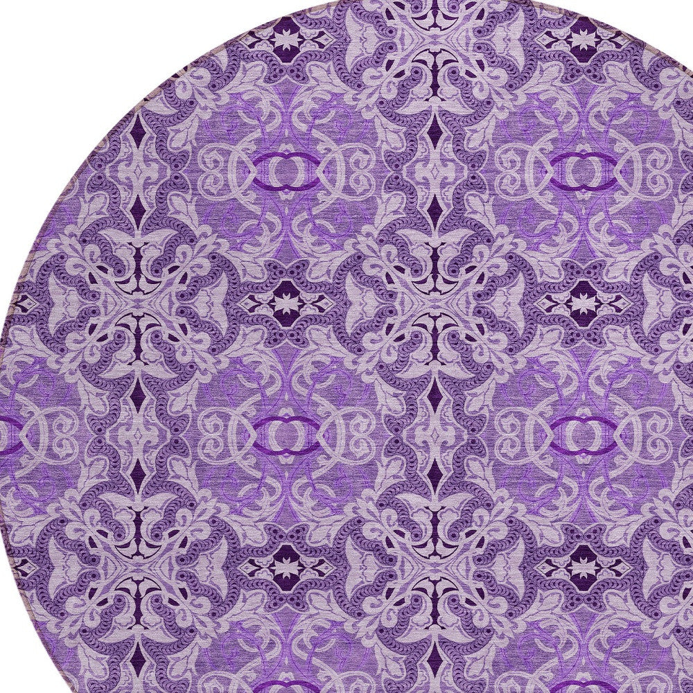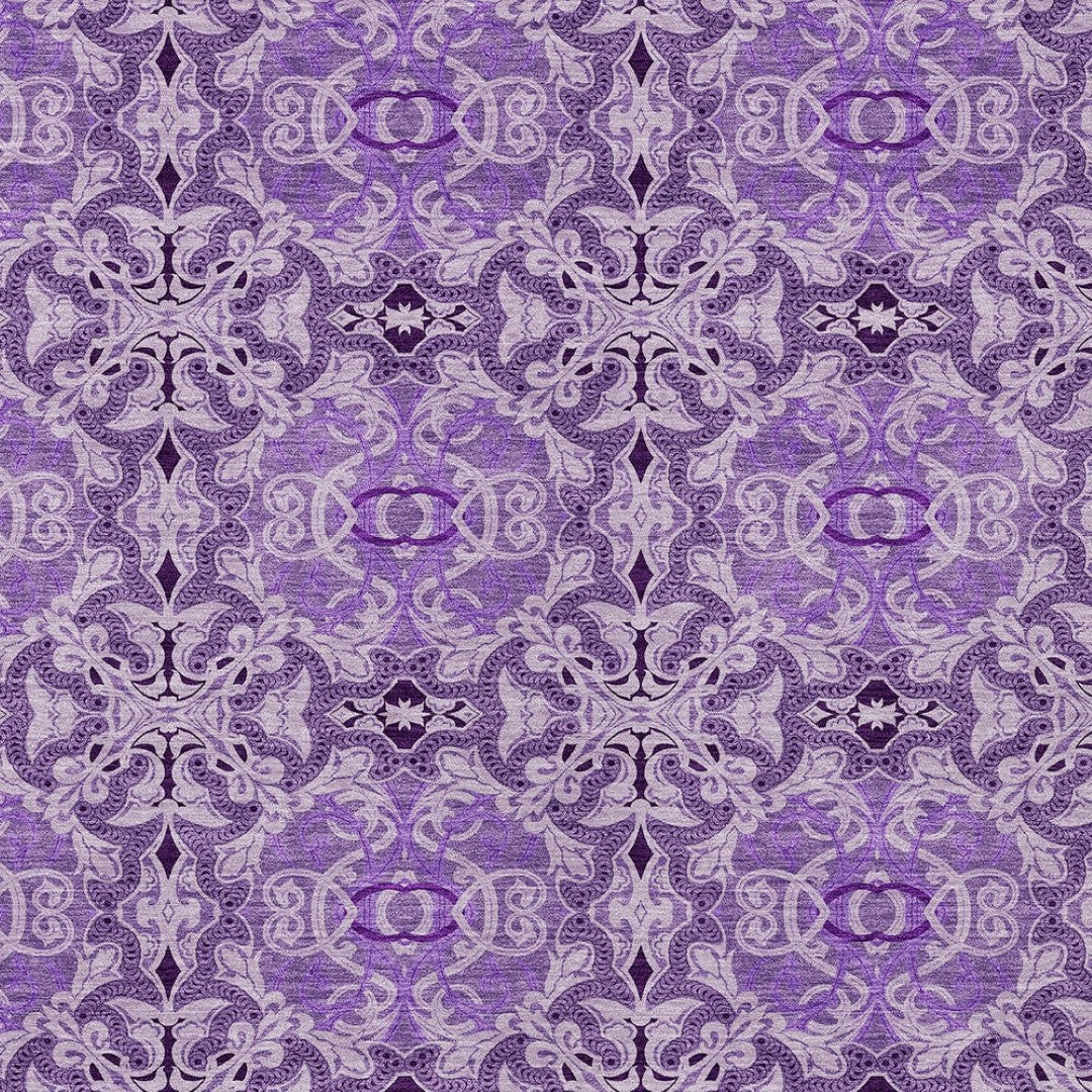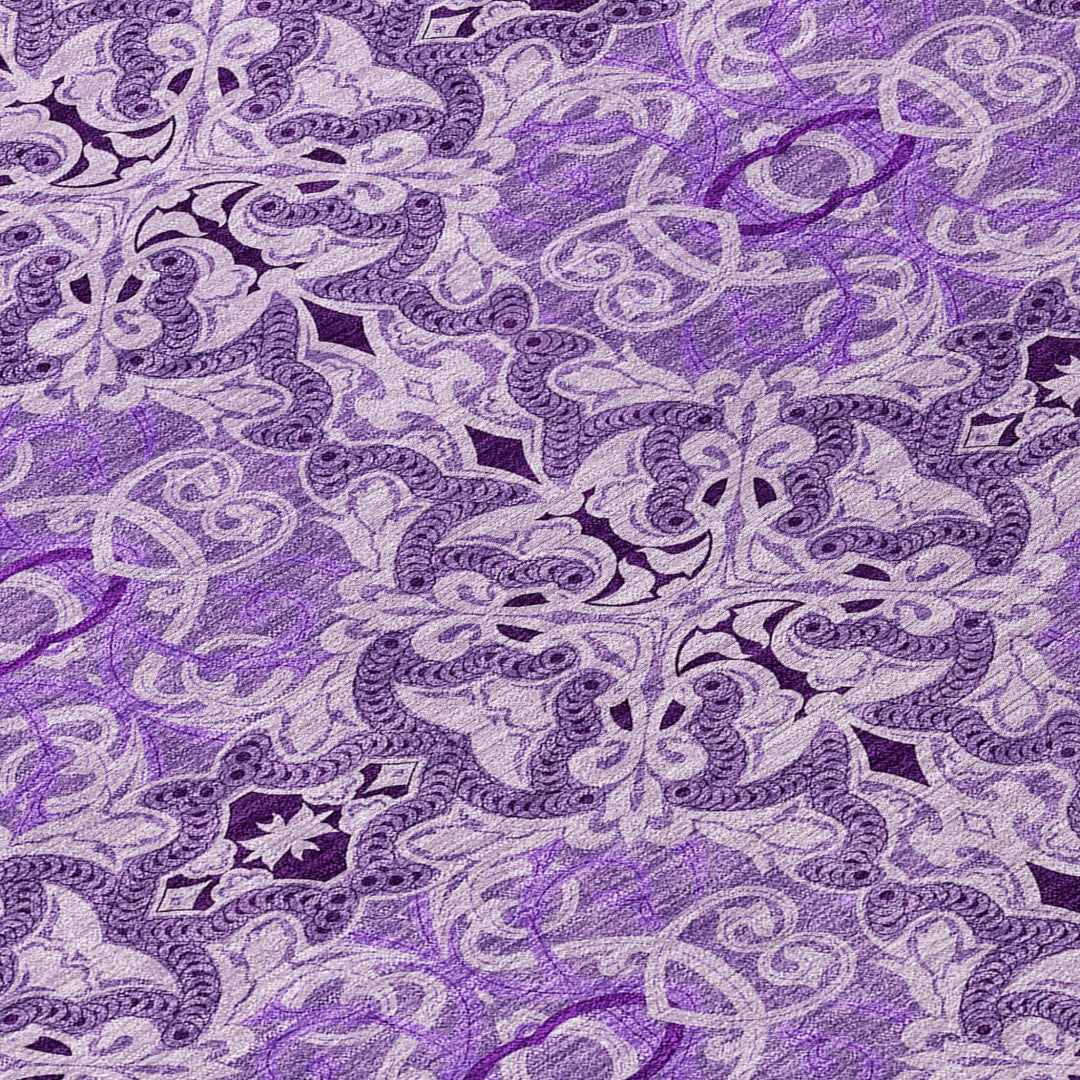 - Machine-made outdoor rug crafted using stain-resistant polyester in a stunning purple and lavender color palette.