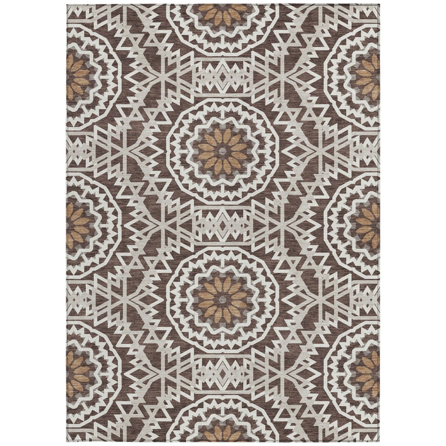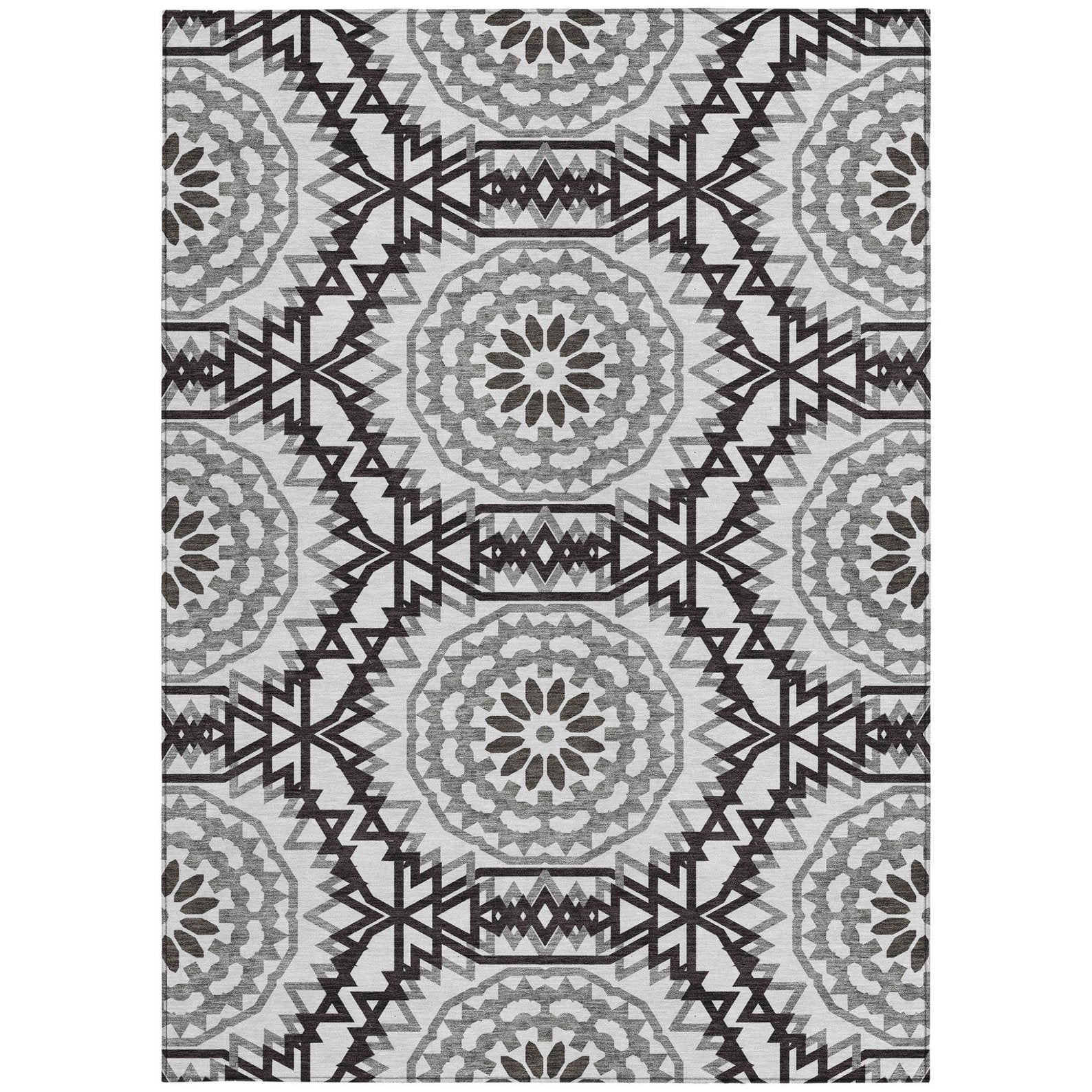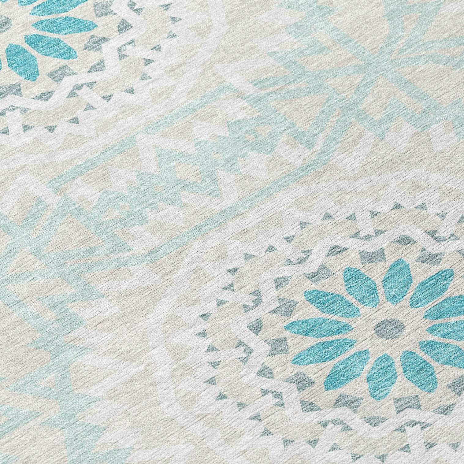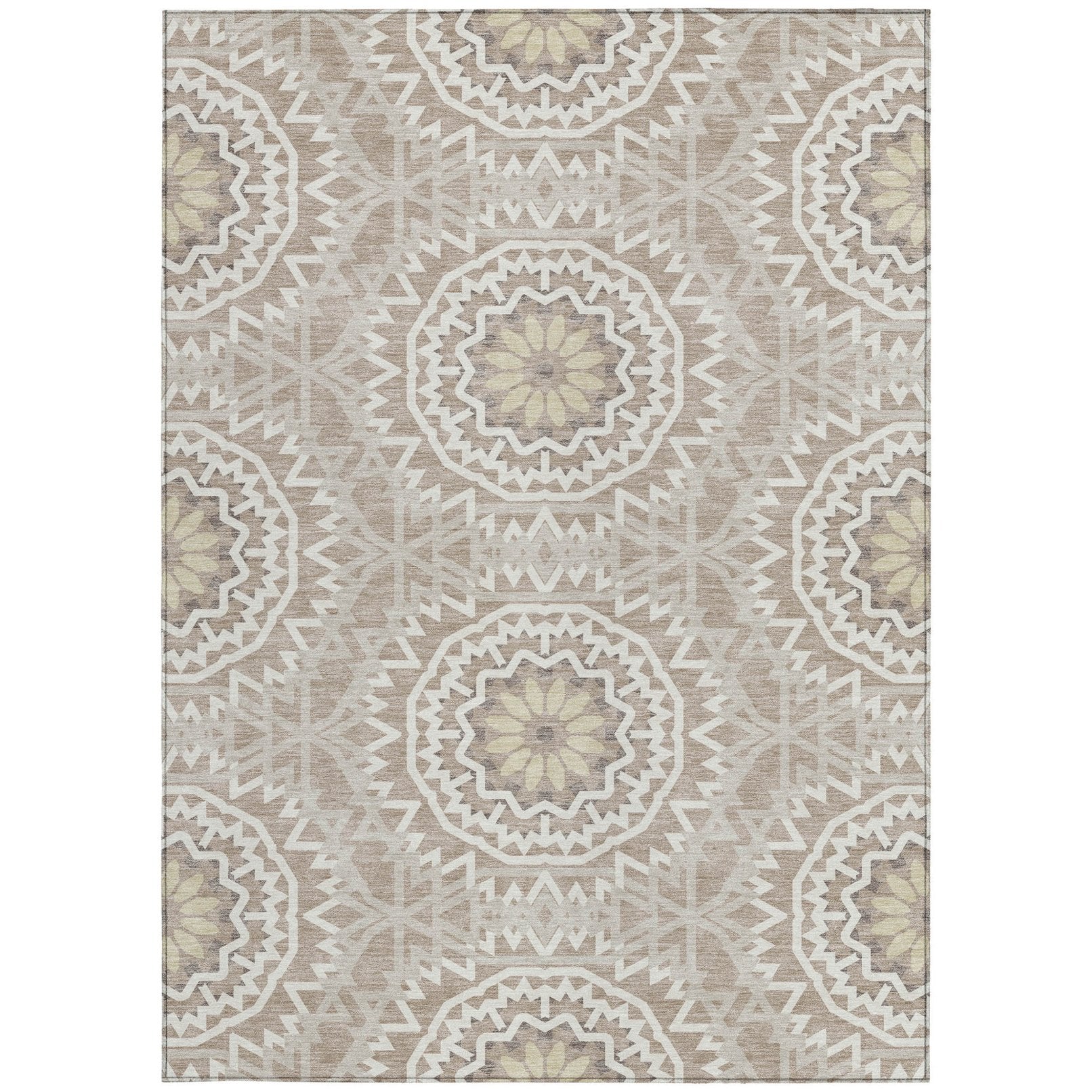 - Stain-resistant outdoor rug with machine-made construction from polyester material.