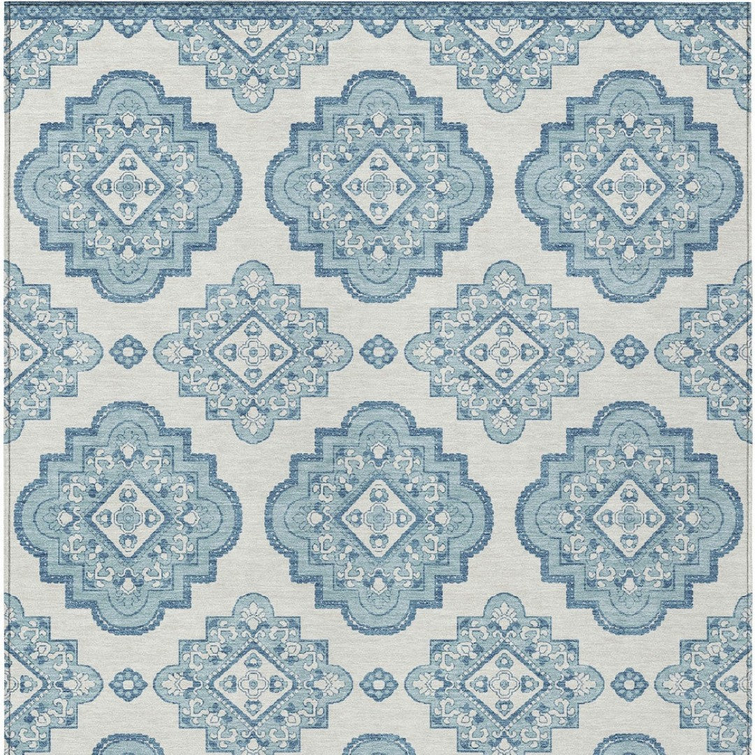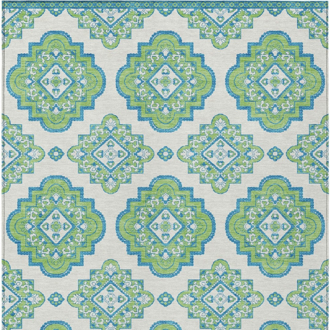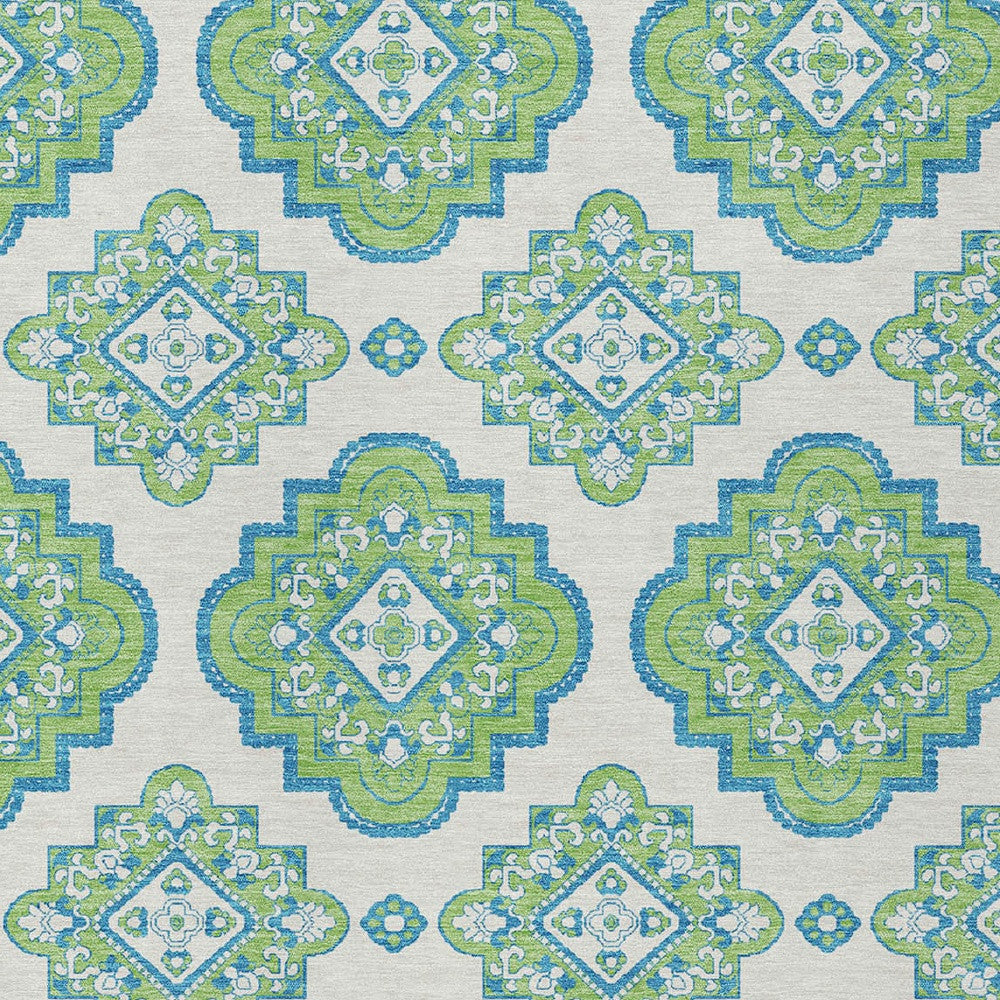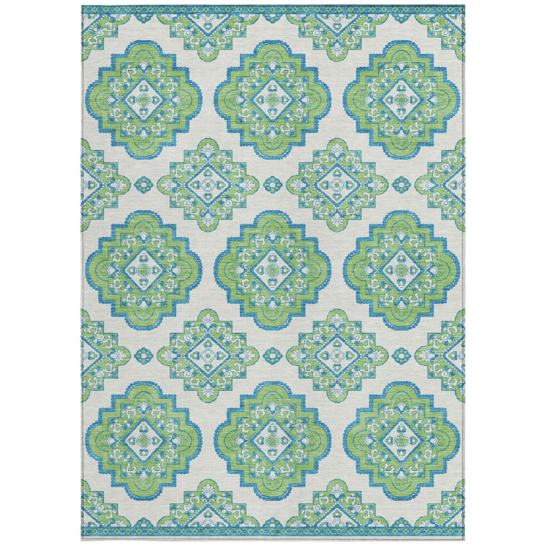 - Machine made outdoor rug with stain-resistant polyester material in teal blue color.