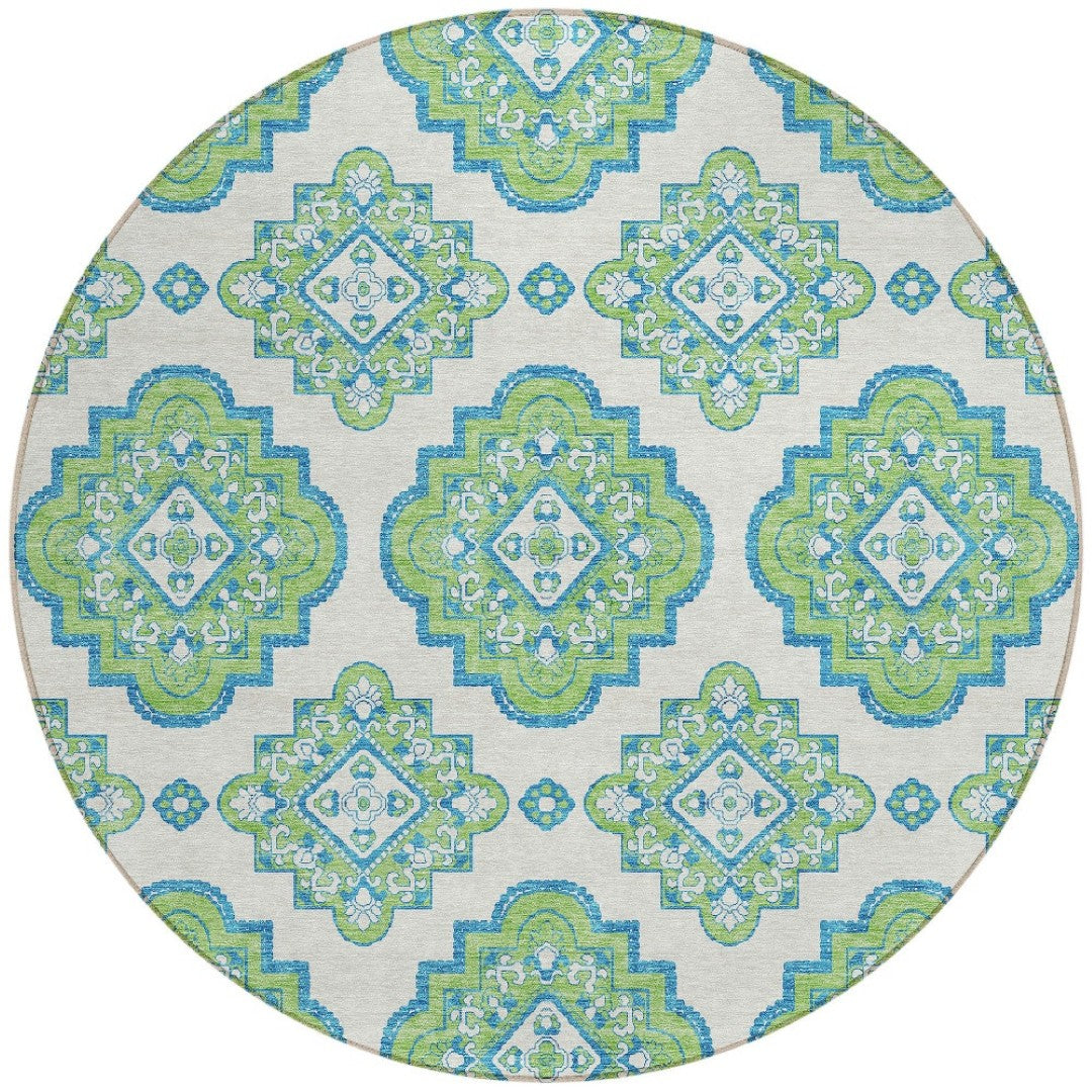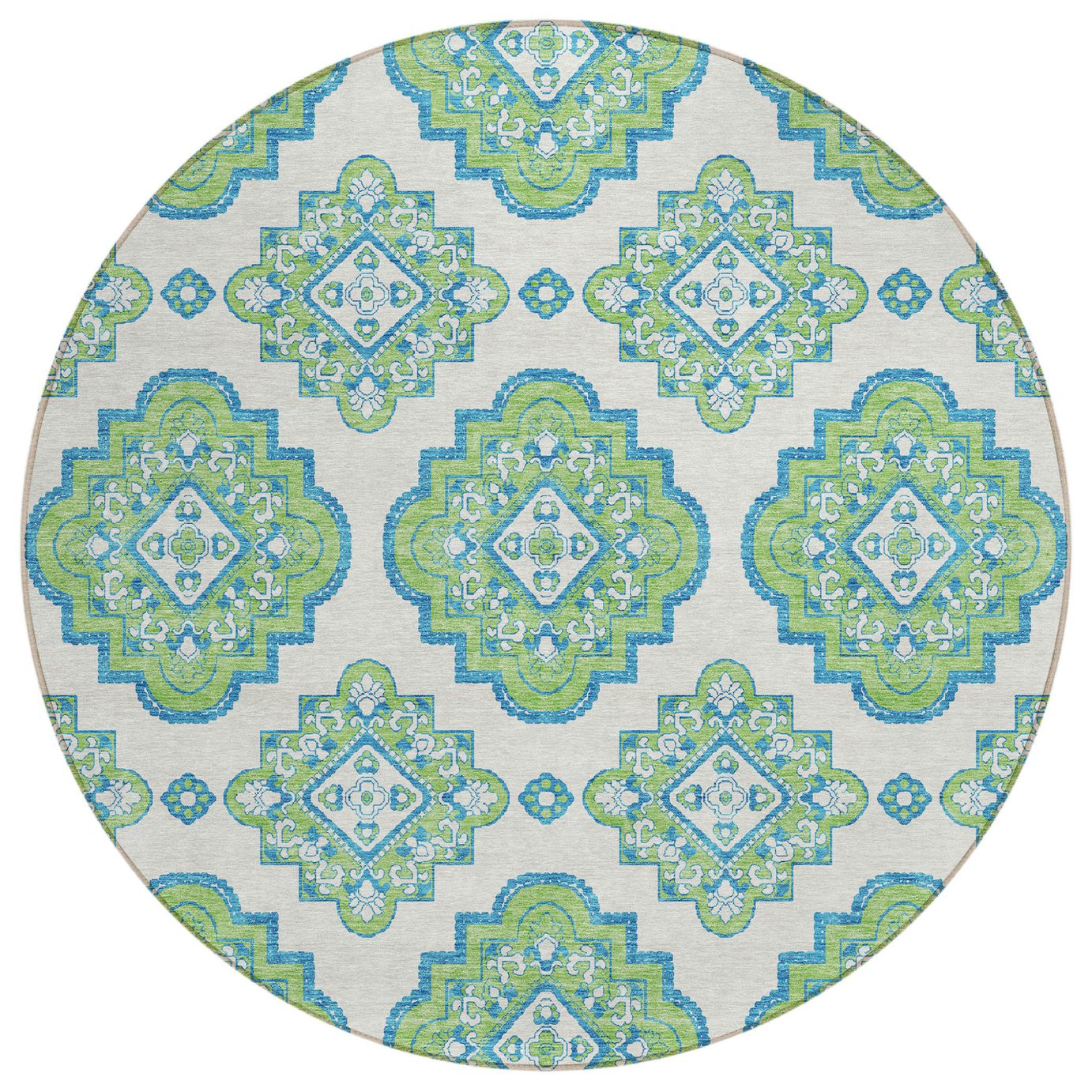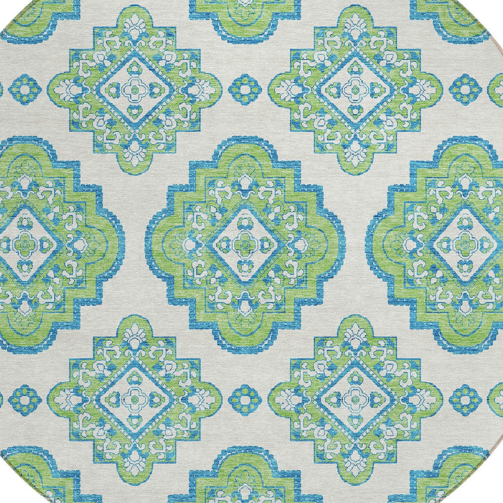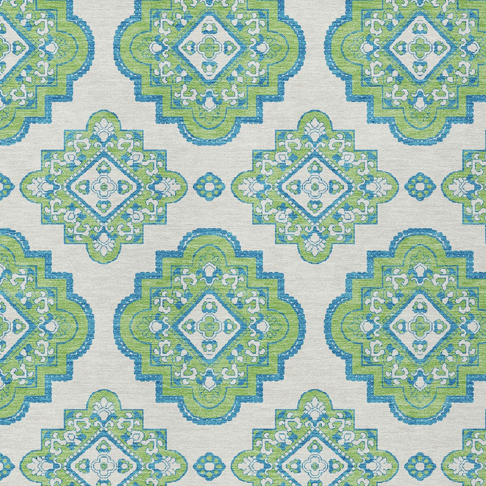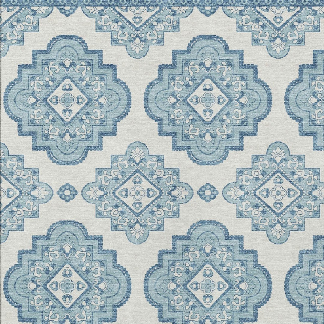 - Machine made outdoor rug with stain-resistant polyester material in teal blue color.